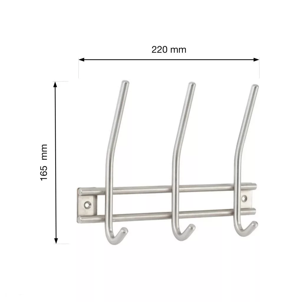 Rozsdamentes acél kabáttartó állvány három akasztóval, 220 mm széles, 165 mm magas és 50 mm mély. Rögzítőcsavarokkal együtt.