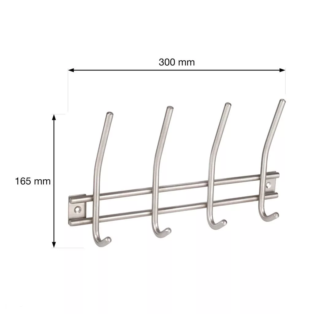 Rozsdamentes acél kabáttartó állvány négy akasztóval, 300 mm széles, 165 mm magas és 50 mm mély. Rögzítőcsavarokkal együtt.