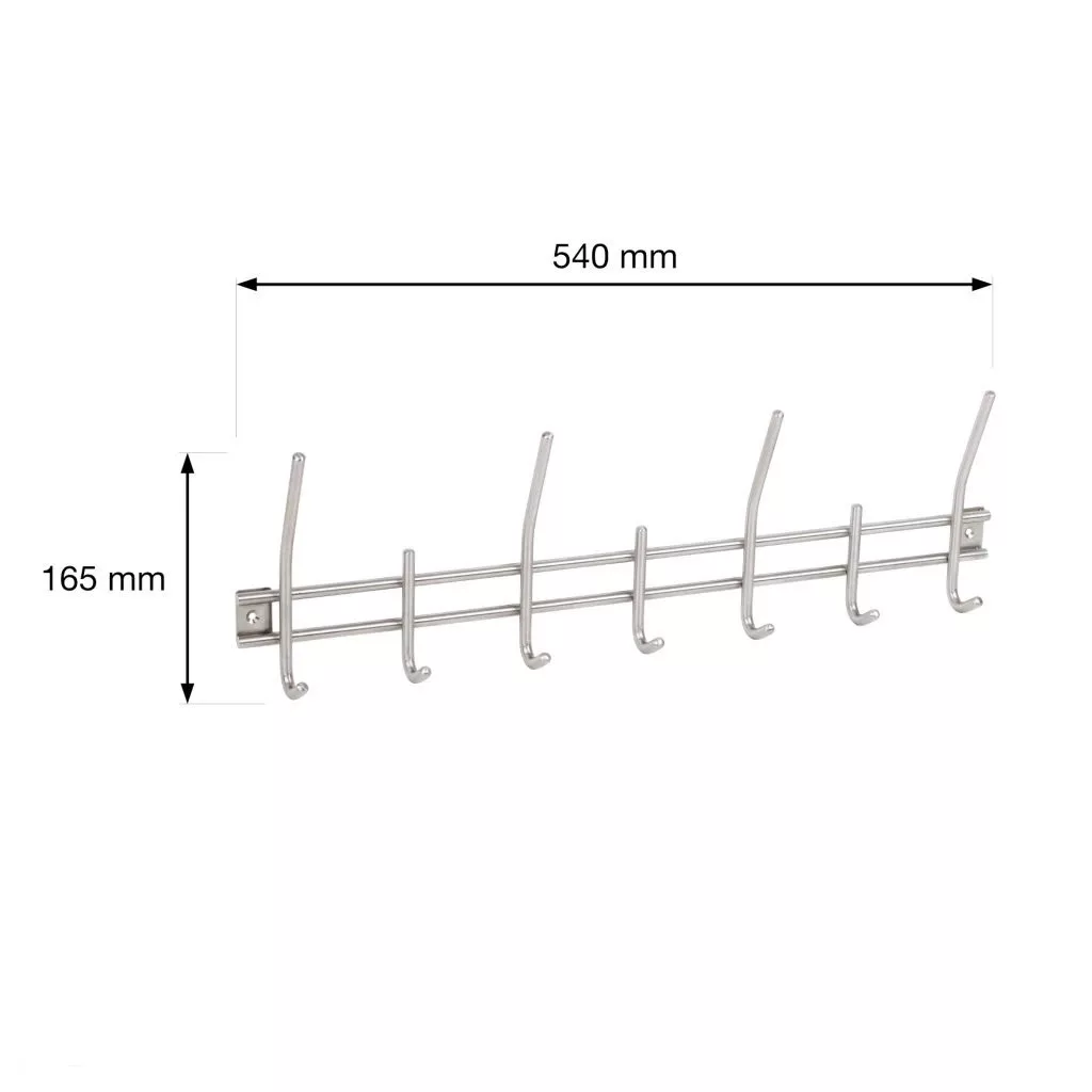 Rozsdamentes acél kabáttartó hét akasztóval, szélessége 540 mm, magassága 165 mm és mélysége 50 mm. Rögzítőcsavarokkal együtt.