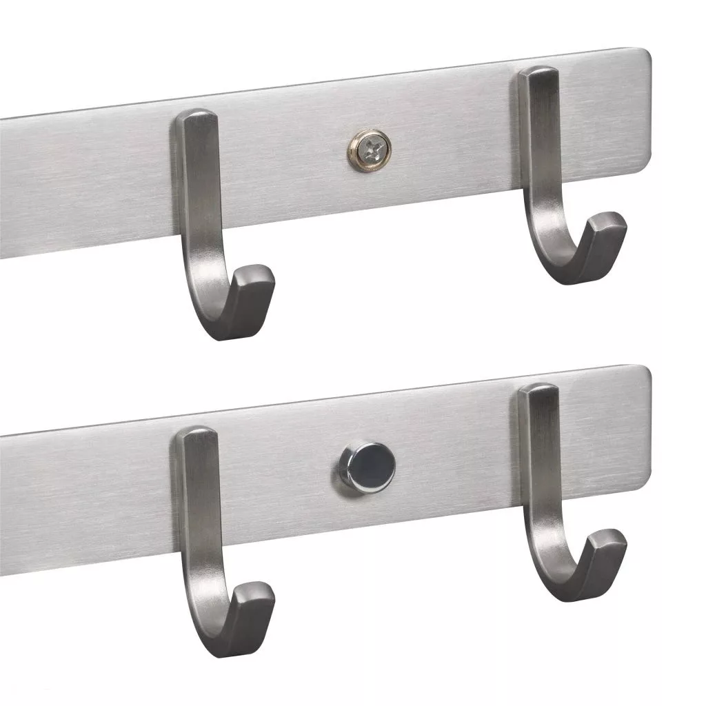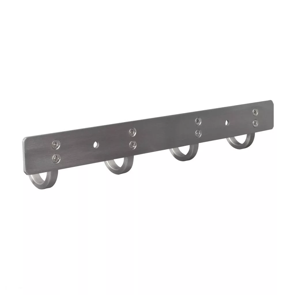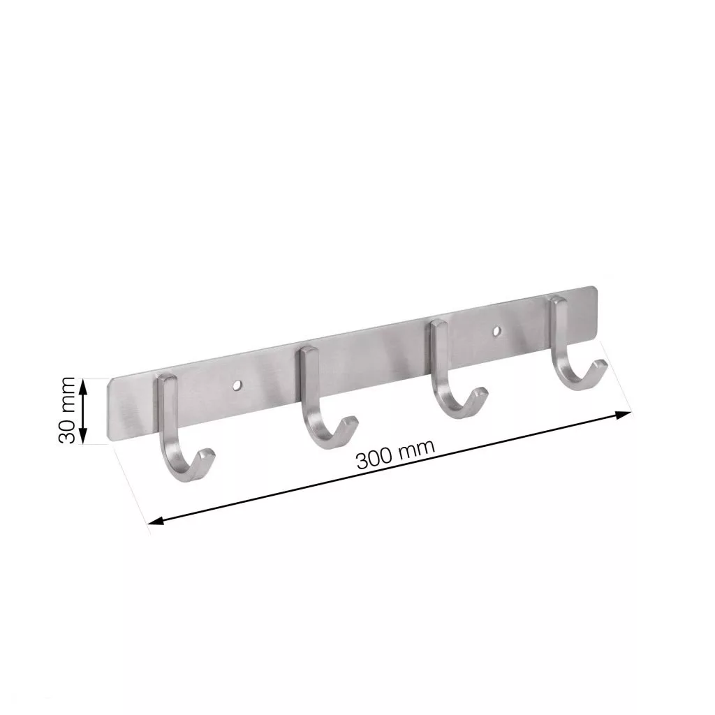 Rozsdamentes acél kabáttartó állvány négy akasztóval, 300 mm széles, 47 mm magas és 40 mm mély. Rögzítőcsavarokkal együtt.