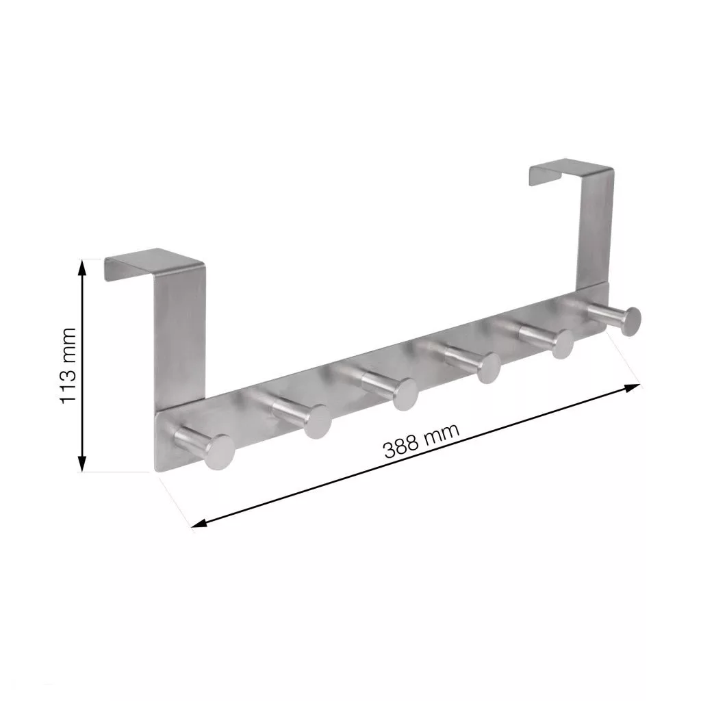 Rozsdamentes acél ajtóakasztó 6 kampóval, szélessége 388 mm, magassága 113 mm és mélysége 85 mm. Akasztómélység 40 mm.