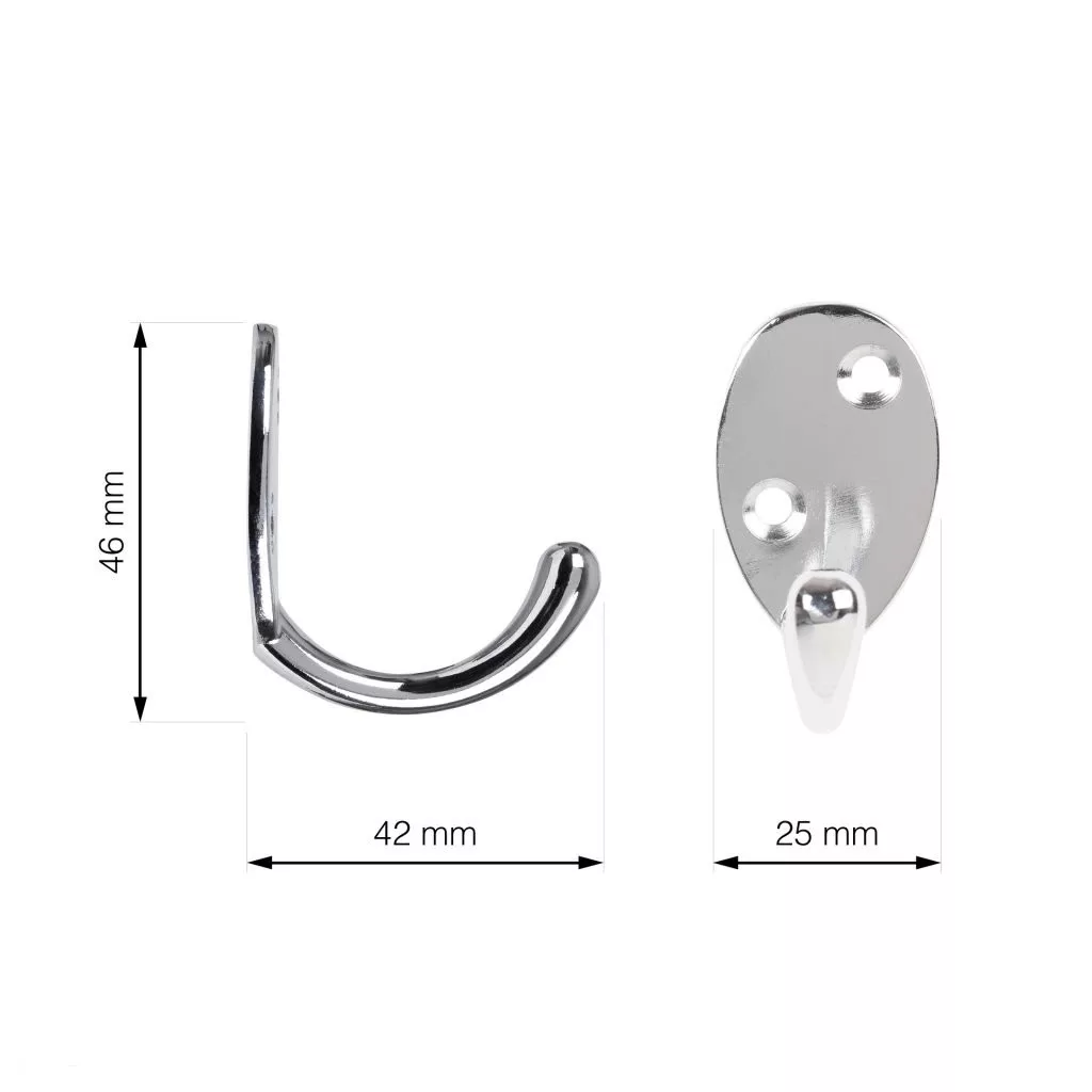 Klasszikus Polaris kabáttartó króm felülettel, egy akasztóval, 25 mm széles, 46 mm magas és 42 mm mély. Falra vagy fa felületre való szereléshez 18 mm távolság. Rögzítőcsavarok mellékelve.