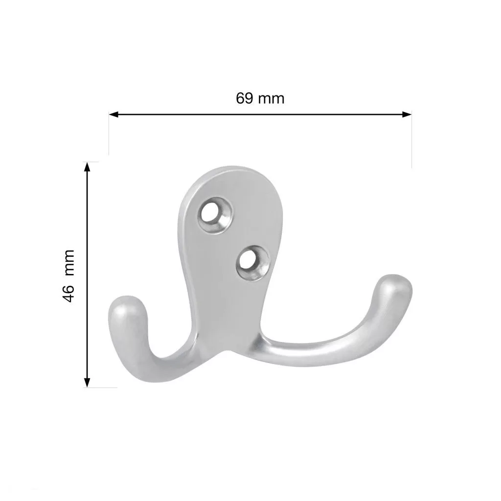 Klasszikus Bonax kabáttartó matt króm kivitelben, két akasztóval, 69 mm széles, 46 mm magas és 26 mm mély. Falra vagy fa felületre való rögzítéshez 15 mm távolság. Rögzítőcsavarok mellékelve.