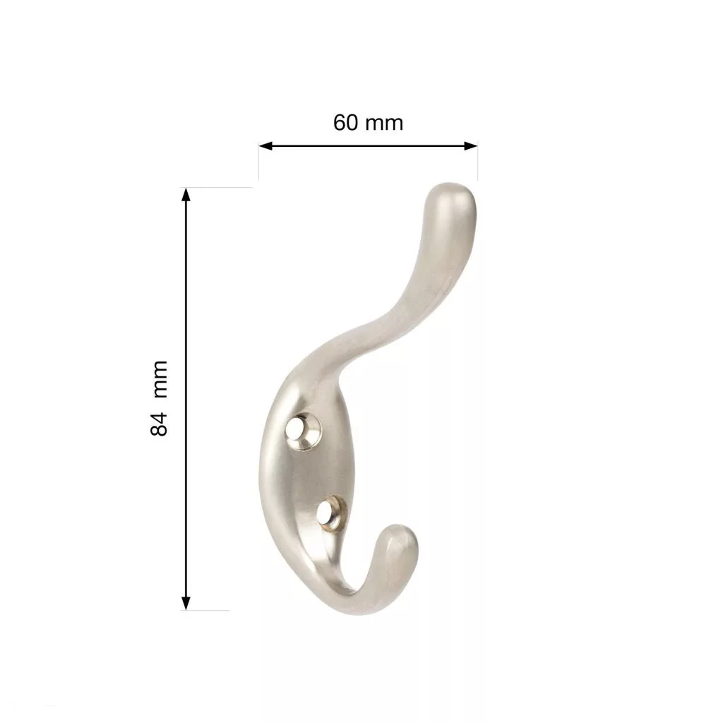Klasszikus Sentini kabáttartó matt nikkel felülettel, két 20 mm széles, 84 mm magas és 60 mm mély akasztóval. Falra vagy fa felületre való rögzítéshez 17 mm-es távolság. Rögzítőcsavarok mellékelve.