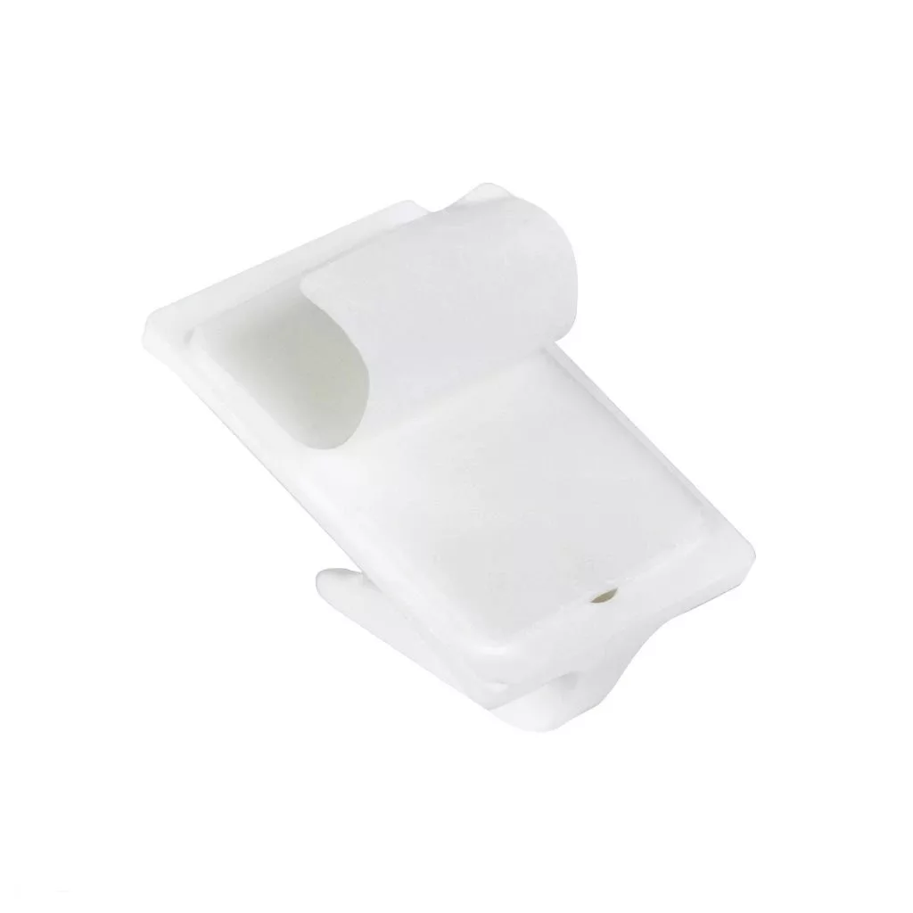 Fehér műanyag QF4 akasztó, 20 mm széles, 30 mm magas és 18 mm mély.
