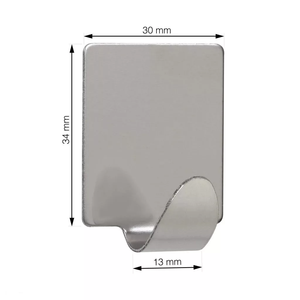 Rozsdamentes acél öntapadós QF15 kampó, 30 mm szélességgel, 34 mm magassággal és 17 mm mélységgel. Az anyaguknak köszönhetően alkalmasak párás környezetbe - nem rozsdásodnak.