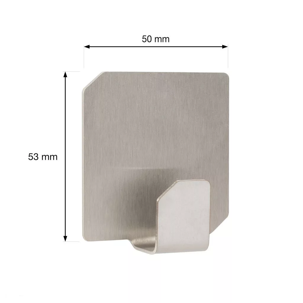 Rozsdamentes acélból készült, öntapadós QF19 kampó, 50 mm szélességgel, 53 mm magassággal és 15 mm mélységgel. Az anyaguknak köszönhetően alkalmasak párás környezetbe - nem rozsdásodnak.
