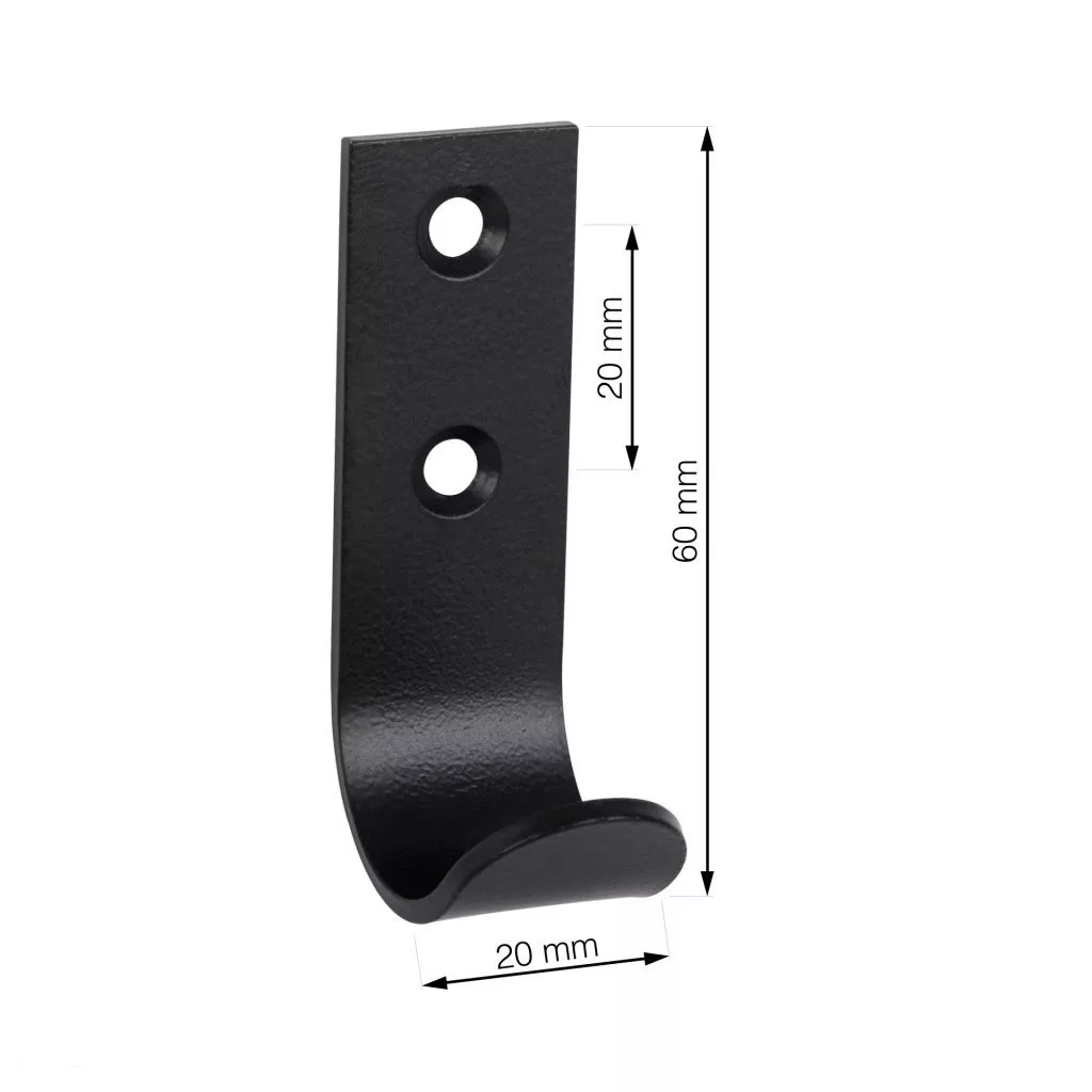 Klasszikus A1-es akasztó fekete kivitelben, 20 mm szélességgel, 60 mm magassággal és 31 mm mélységgel. Falra vagy fa felületre történő rögzítéshez 20 mm távolságra van egymástól.