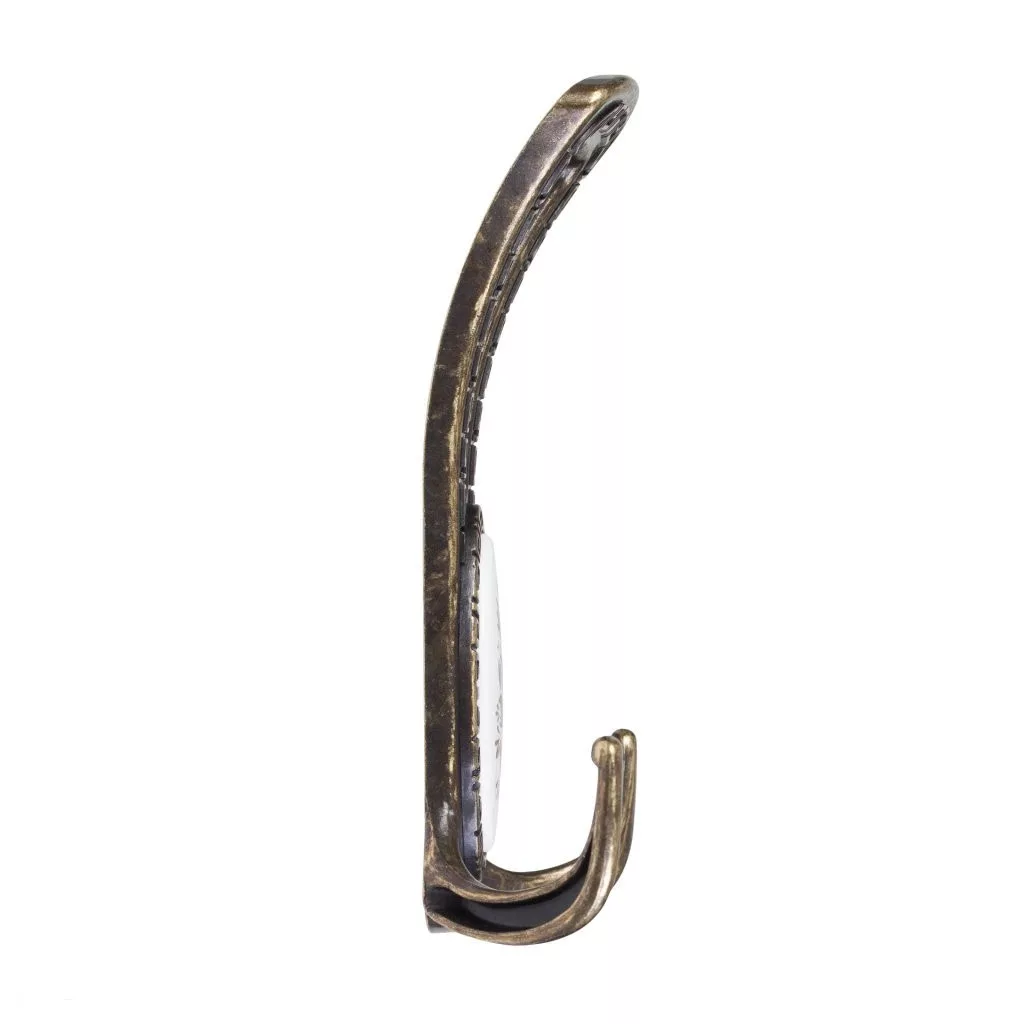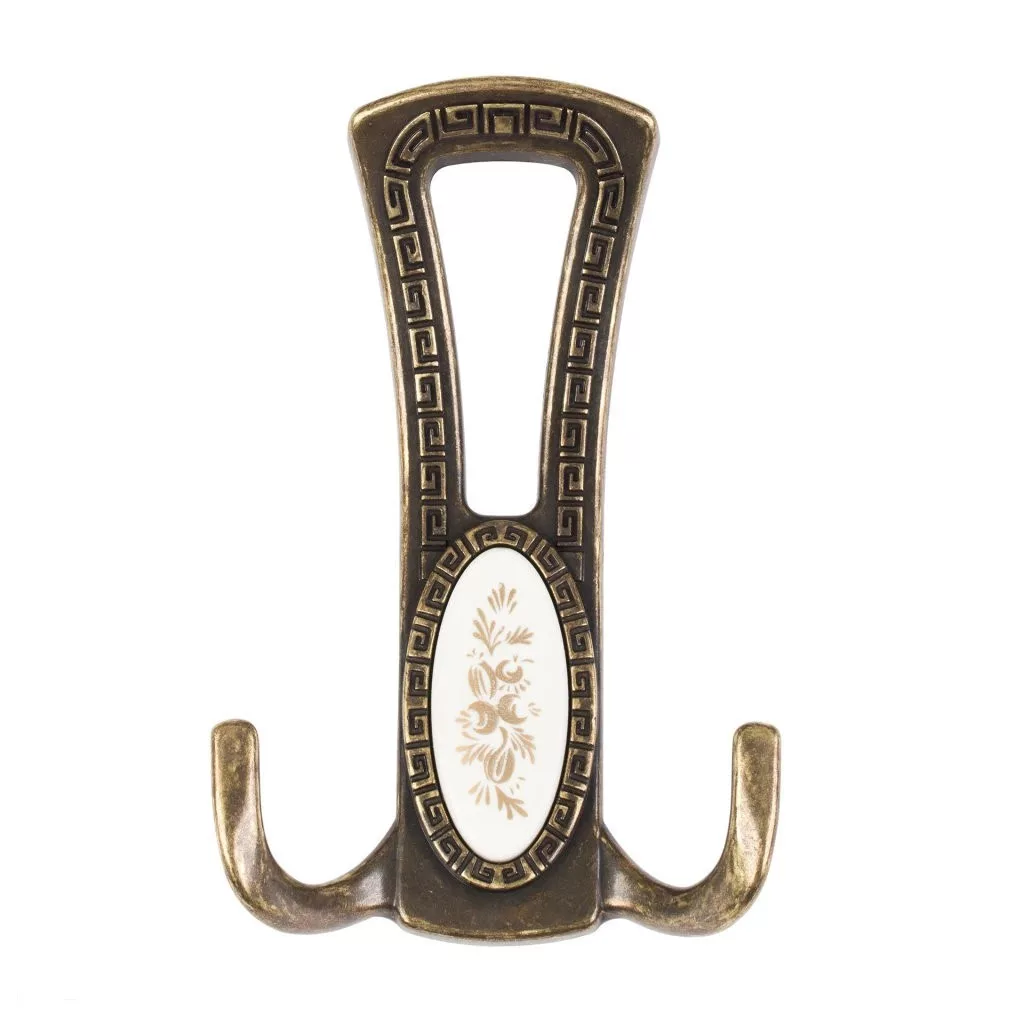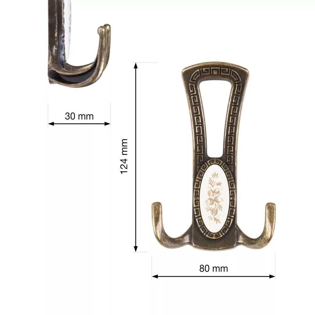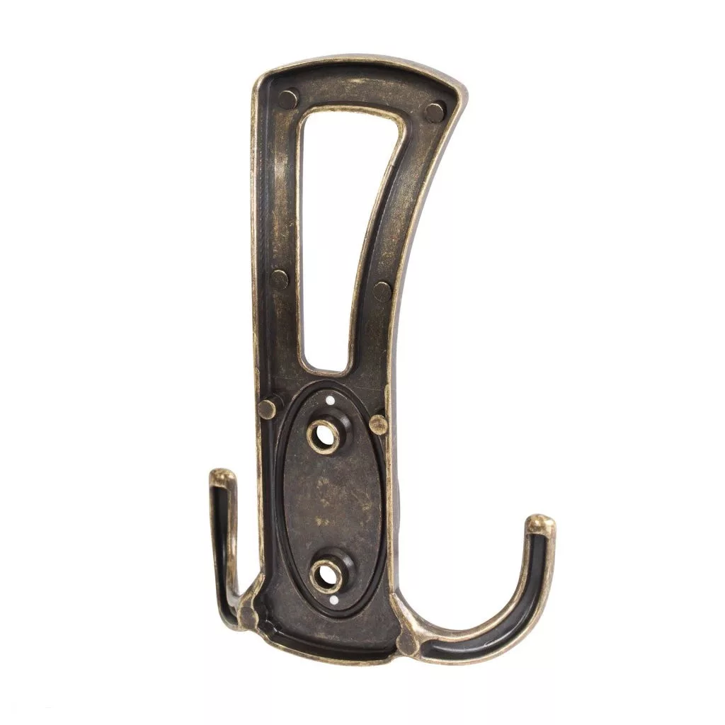Rusztikus, Fatih I kabáttartó fogas antik sárgarézből, díszsel és két akasztóval, szélessége 80 mm, magassága 124 mm és mélysége 30 mm. Falra vagy fa felületre való rögzítéshez 30 mm távolság. Rögzítőcsavarokkal együtt.