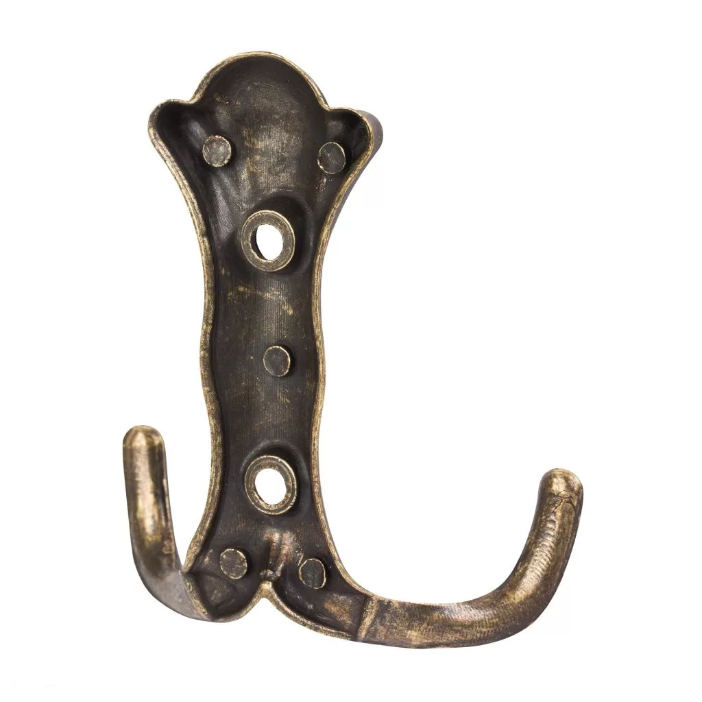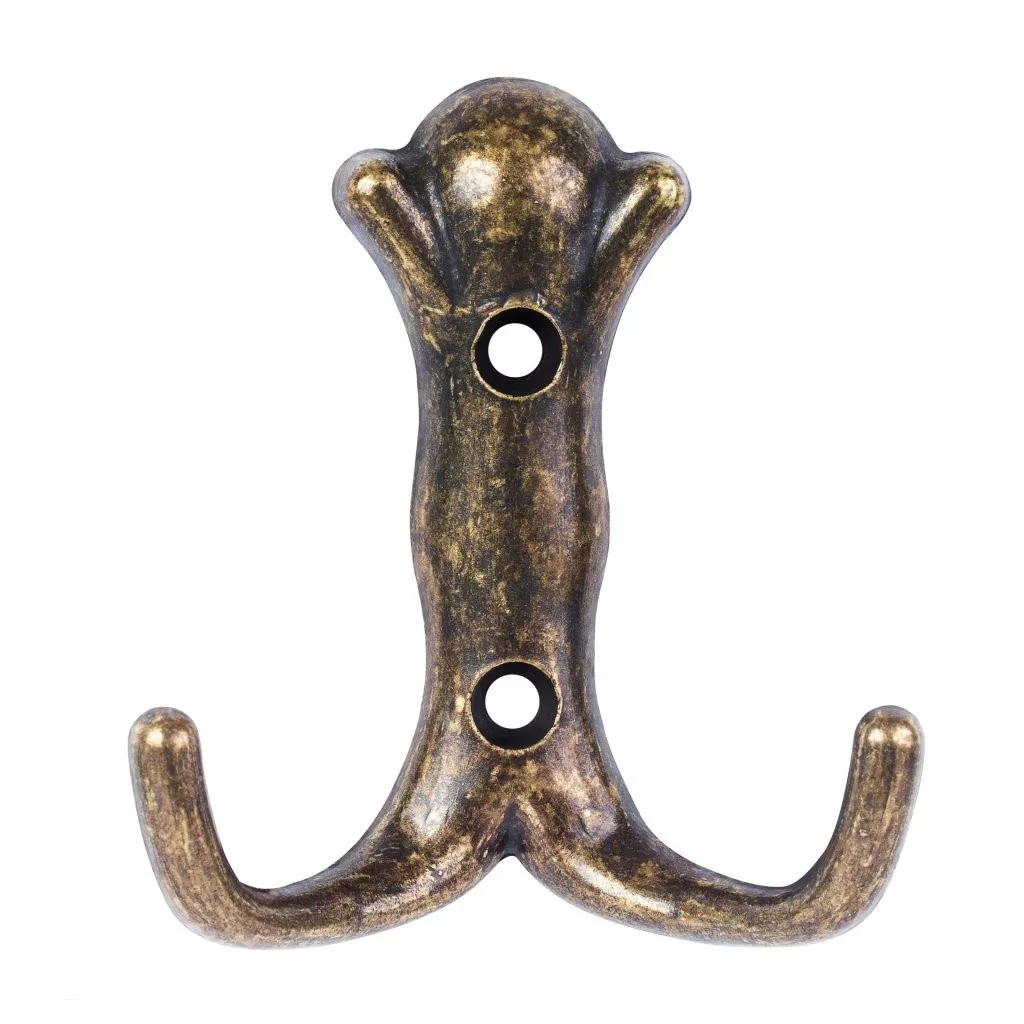 Rusztikus Berfi kabáttartó antik sárgaréz kivitelben, két akasztóval, 72 mm széles, 80 mm magas és 26 mm mély. Falra vagy fa felületre való rögzítéshez 32 mm távolság. Rögzítőcsavarokkal együtt.