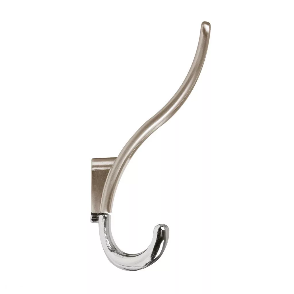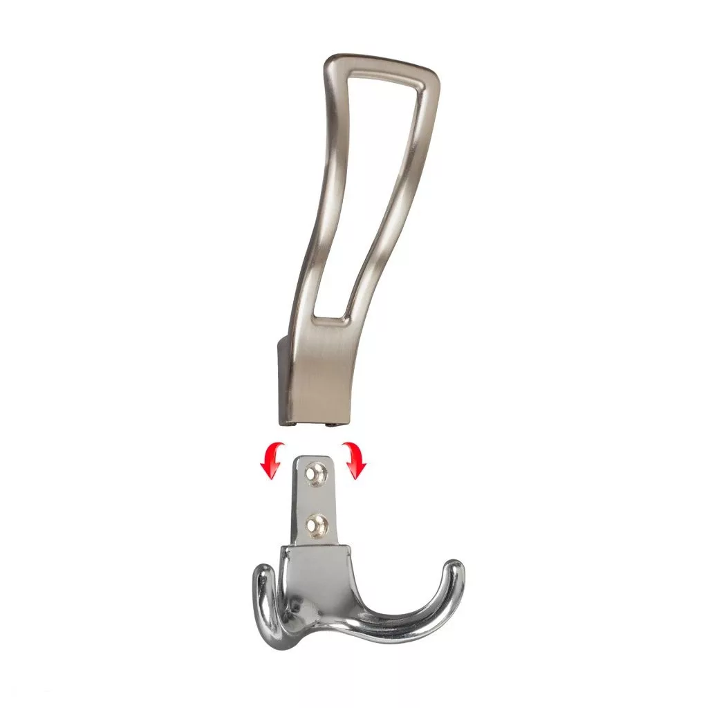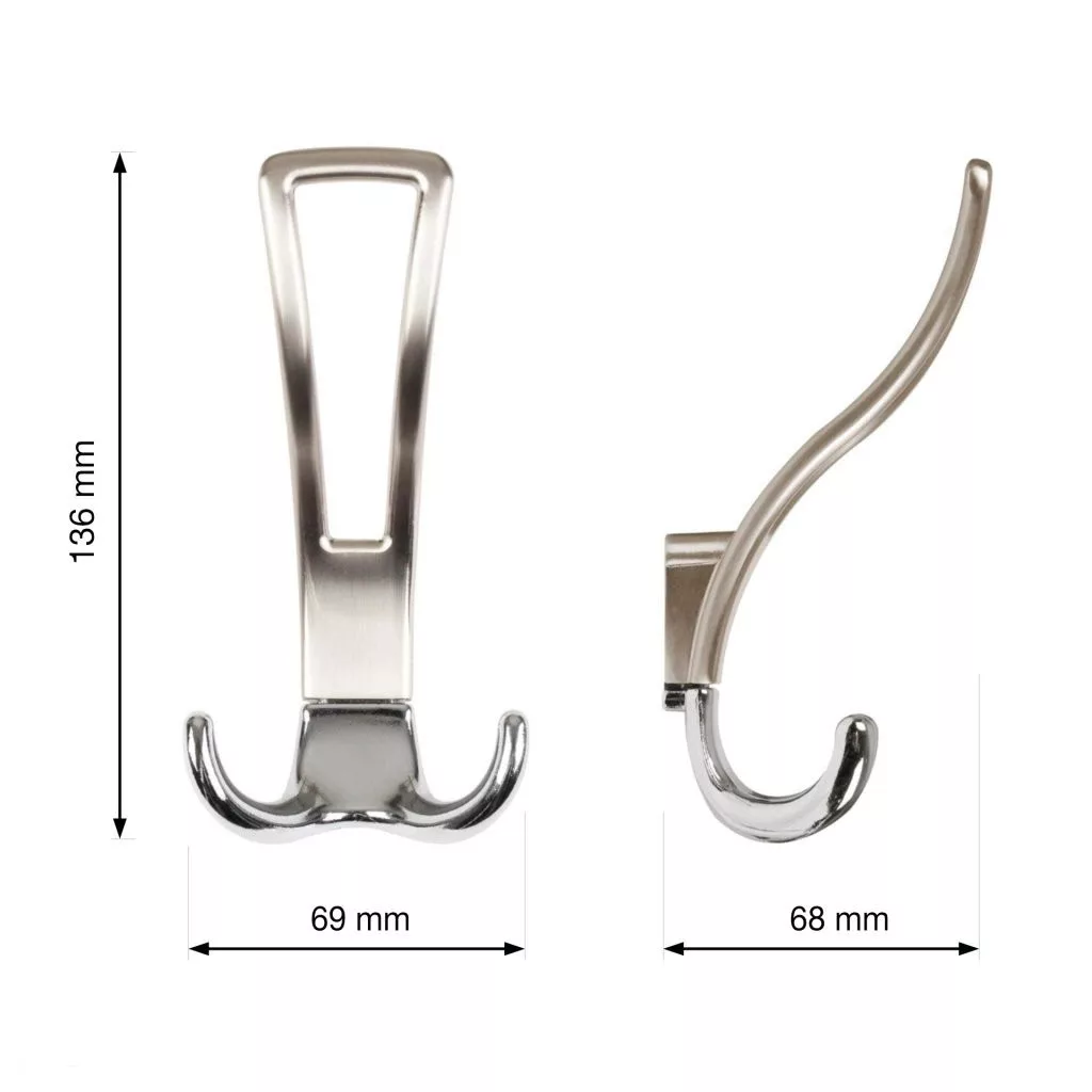 Klasszikus Monde I kabáttartó állvány szálcsiszolt szatén nikkel és króm kombinációjában, két 69 mm széles, 136 mm magas és 68 mm mély akasztóval. Falra vagy fa felületre való rögzítéshez 16 mm-es távolság. Rögzítőcsavarok mellékelve.