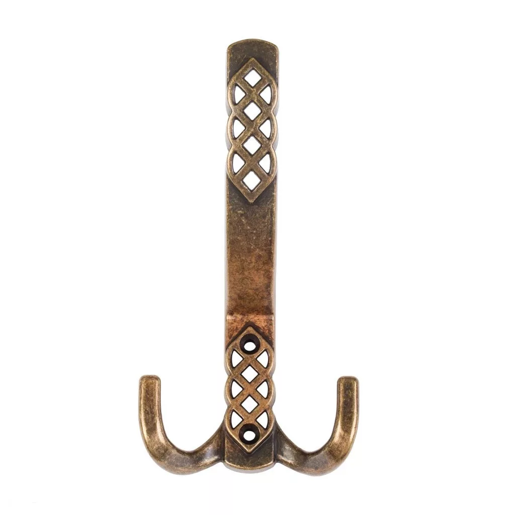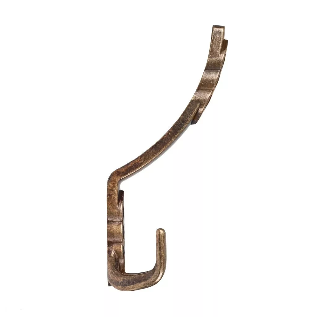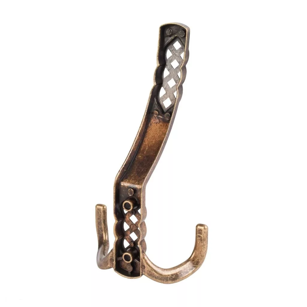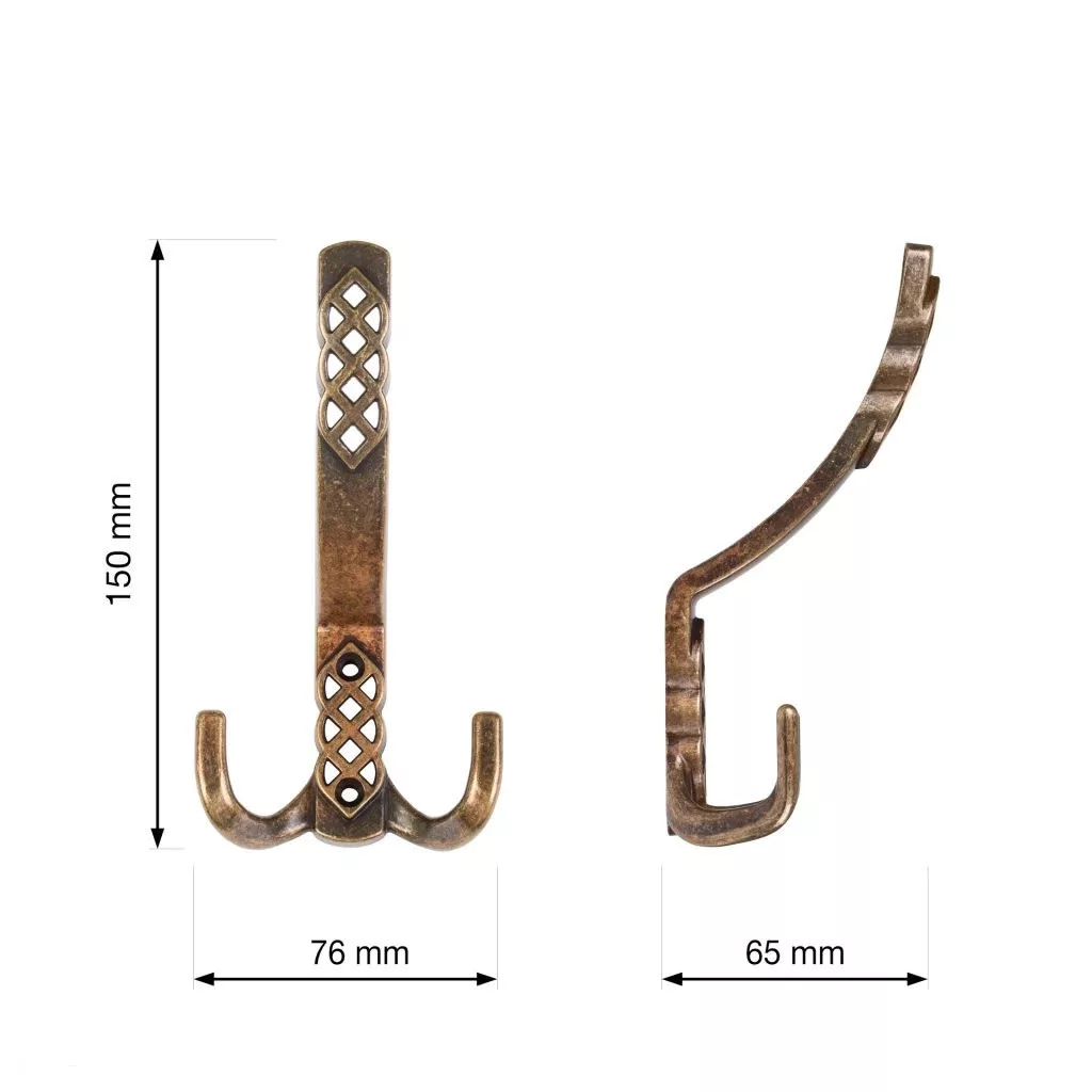 Rusztikus Santes I kabáttartó fogas antik sárgarézből, két akasztóval, 76 mm széles, 150 mm magas és 65 mm mély. Falra vagy fa felületre való rögzítéshez 32 mm távolság. Rögzítőcsavarokkal együtt.