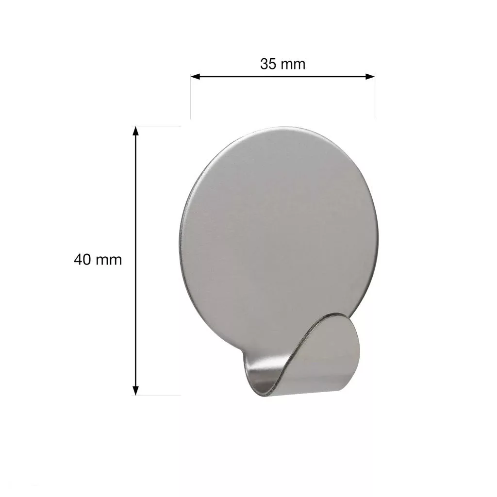 Kerek, rozsdamentes acélból készült, öntapadós akasztó, 35 mm szélességgel, 40 mm magassággal és 17 mm mélységgel. Az anyaguknak köszönhetően alkalmasak párás környezetbe - nem rozsdásodnak.