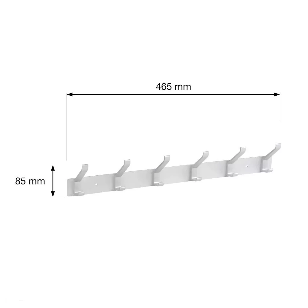 Alumínium kabáttartó fogas hat akasztóval, szélessége 465 mm, magassága 85 mm és mélysége 55 mm. Rögzítőcsavarokkal együtt.