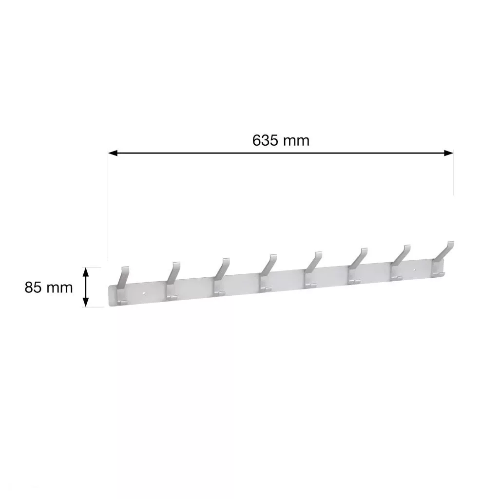 Alumínium kabáttartó állvány nyolc akasztóval, szélessége 635 mm, magassága 85 mm és mélysége 55 mm. Rögzítőcsavarokkal együtt.