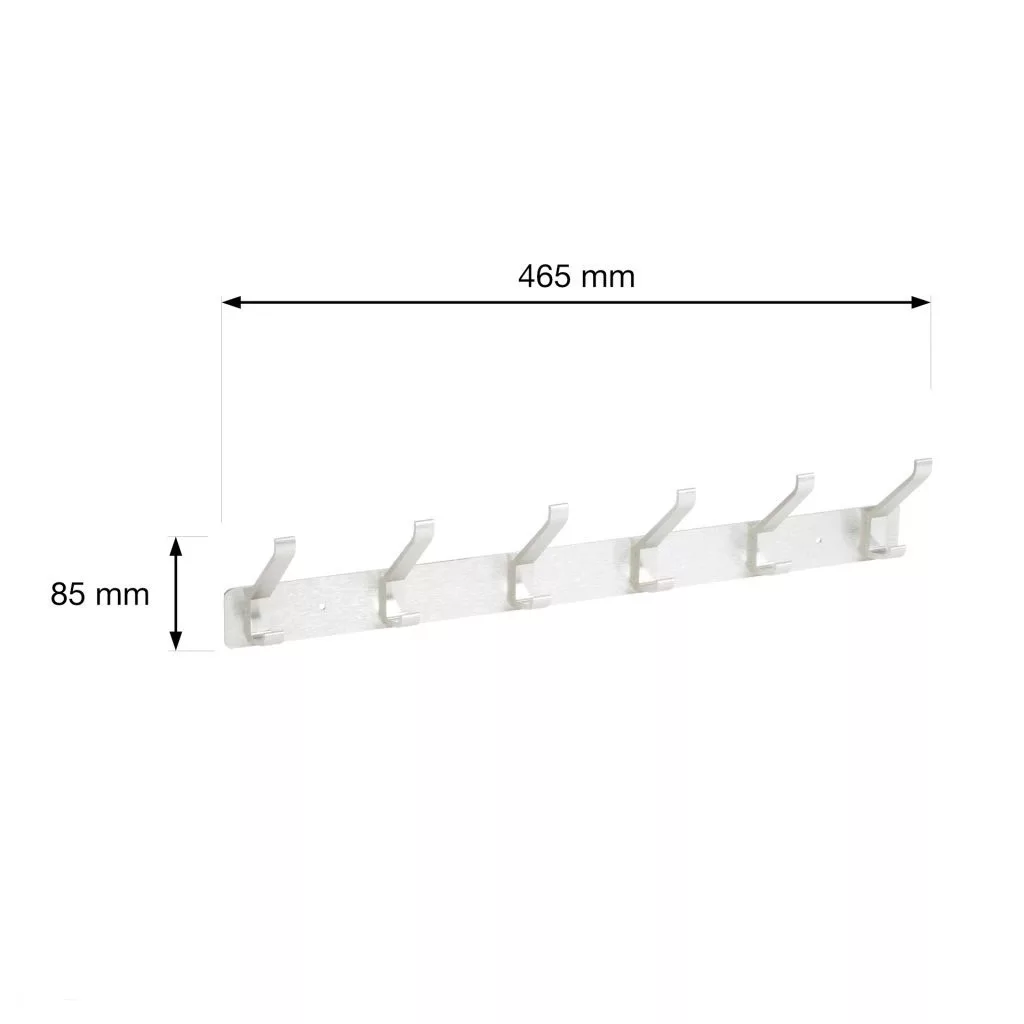 Alumínium kabáttartó fogas hat akasztóval, szálcsiszolt szatén nikkel felülettel, 465 mm széles, 85 mm magas és 55 mm mély. Rögzítőcsavarokkal együtt.