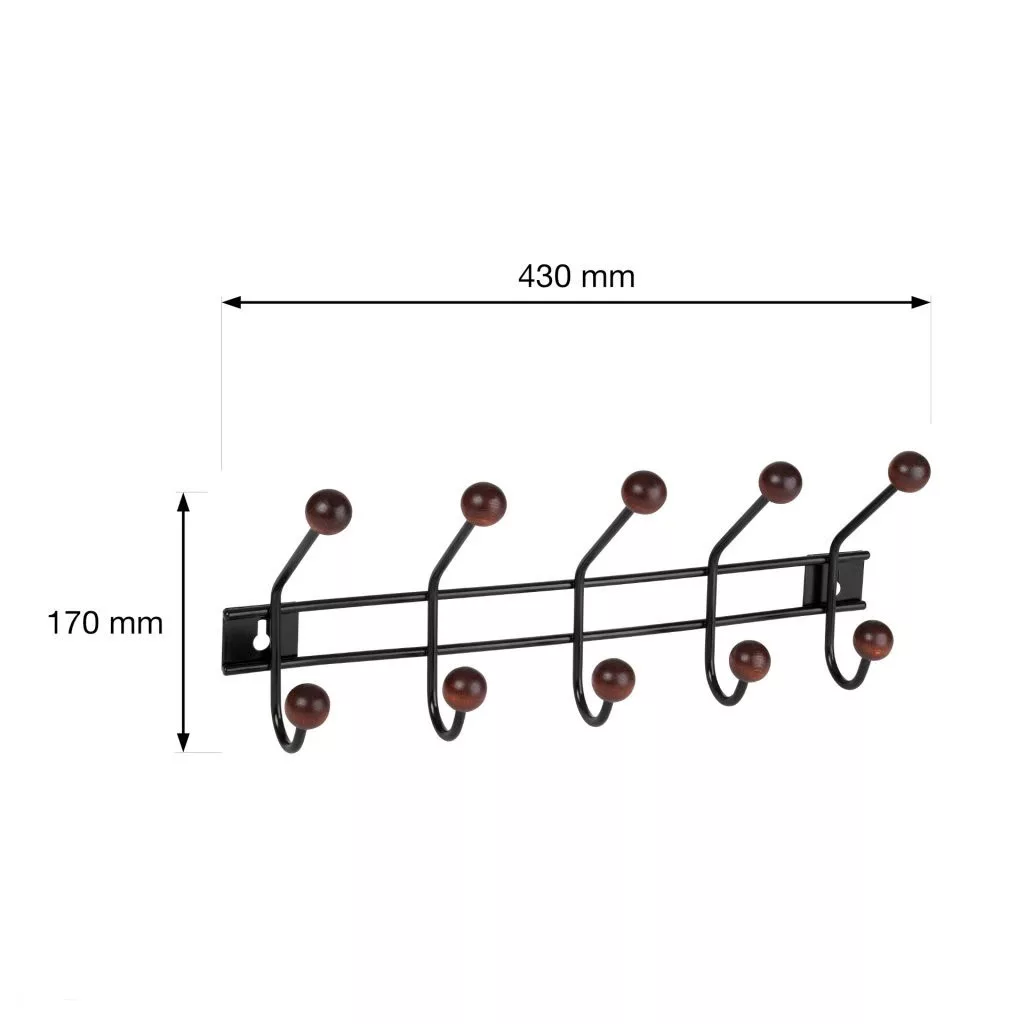 Fekete kabáttartó fogas öt akasztóval, tetején barna fagolyókkal, 430 mm széles, 170 mm magas és 105 mm mély. Rögzítőcsavarokkal együtt.