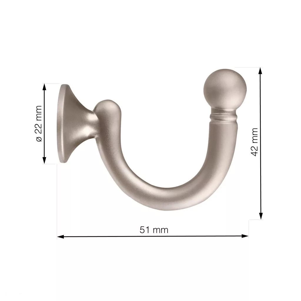 Klasszikus Hubert kabáttartó matt nikkel felülettel, 22 mm széles, 42 mm magas és 51 mm mély. Rögzítőcsavarral együtt.