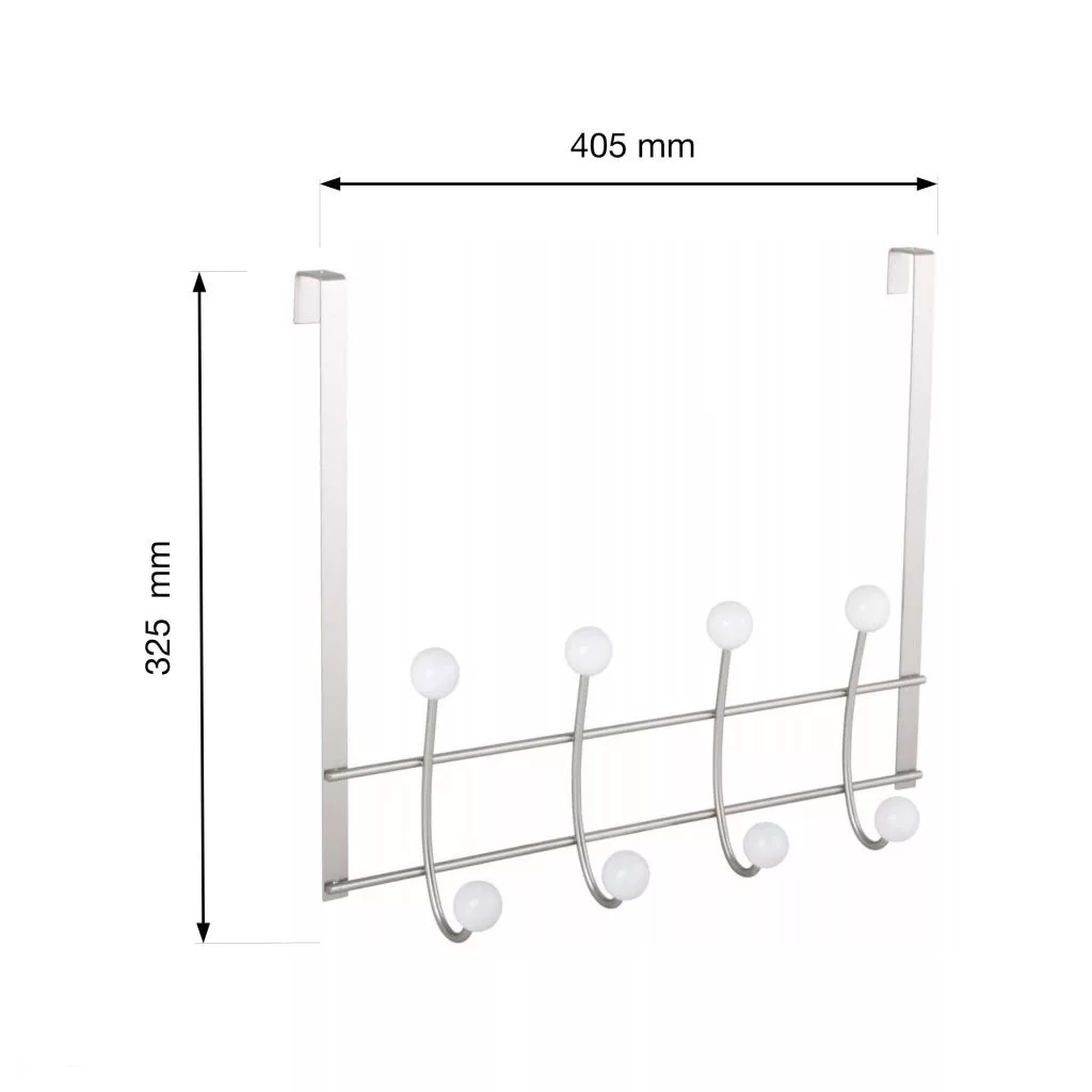 Ajtóakasztó 4 matt nikkel bevonatú kampóval, 405 mm széles, 325 mm magas és 80 mm mély. A kampók tetején és alján fehér golyó található. Akasztó szélessége 20 mm.