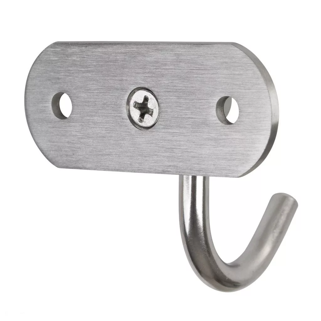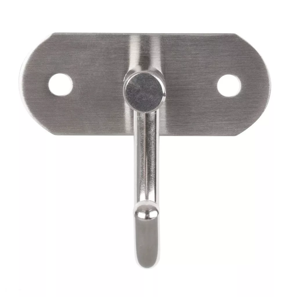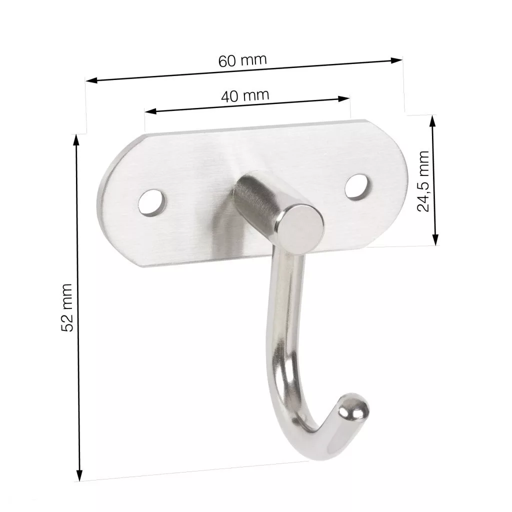 Klasszikus rozsdamentes acél akasztó, 60 mm széles és 52 mm teljes magassággal. Falra vagy fa felületre történő szereléshez 40 mm távolság szükséges. Rögzítőcsavarok mellékelve.