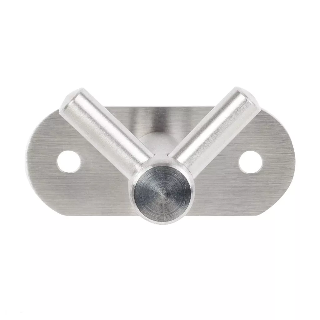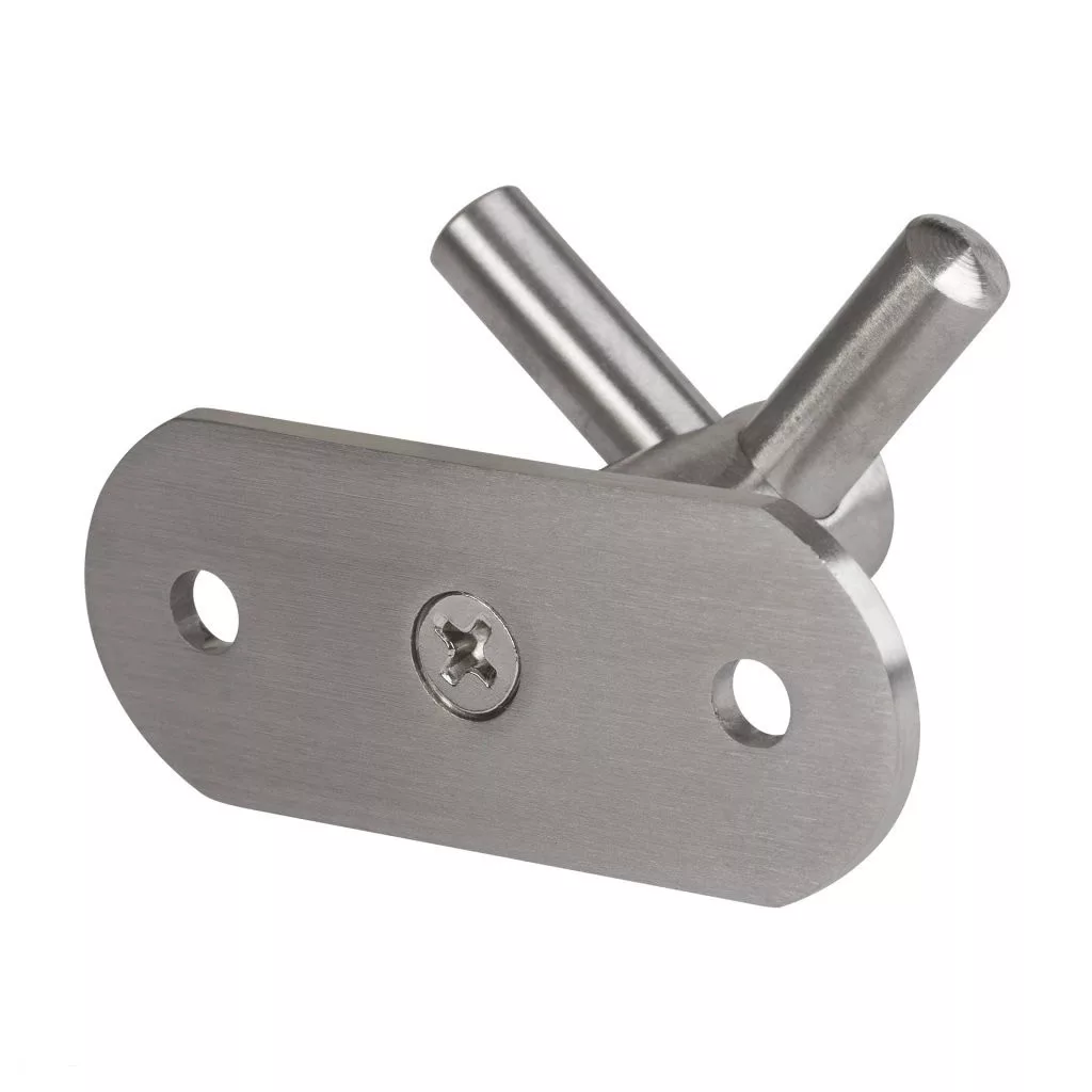 Klasszikus rozsdamentes acél akasztó dupla akasztóval, szélessége 60 mm, magassága 33 mm és mélysége 39 mm. Falra vagy fa felületre történő szereléshez 40 mm távolság szükséges. Rögzítőcsavarok mellékelve.