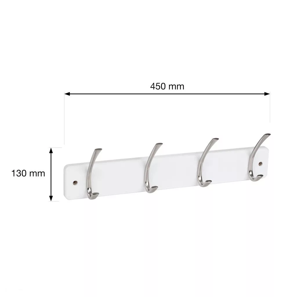 Fehér fa kabáttartó négy akasztóval, matt nikkel felülettel, 450 mm széles, 130 mm magas és 80 mm mély. Rögzítőcsavarokkal együtt.