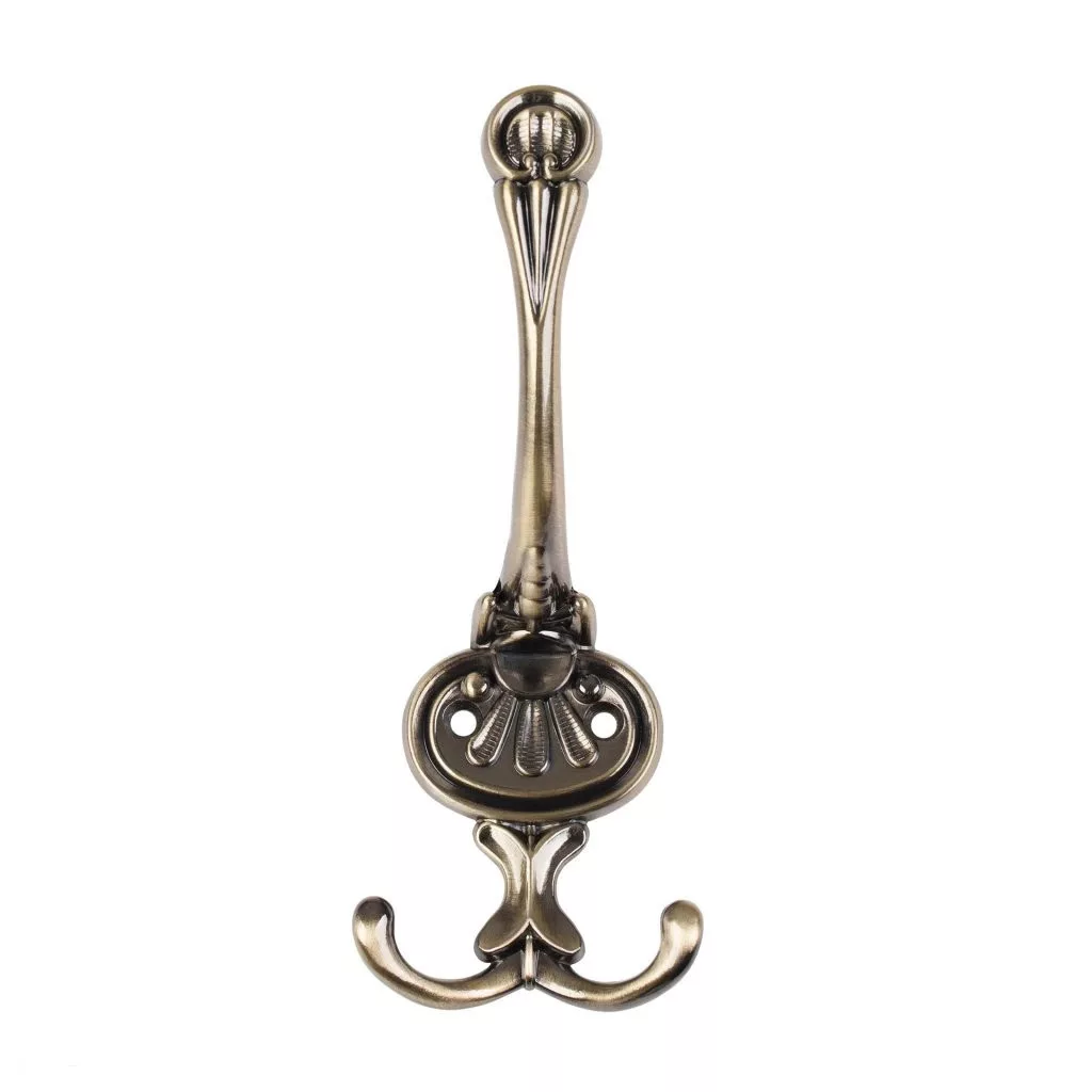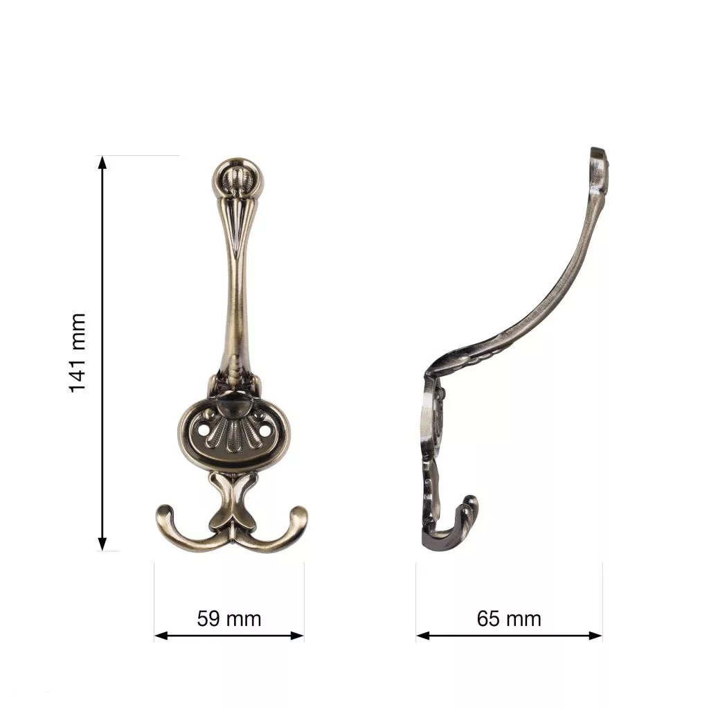 Rusztikus Bree I kabáttartó fogas antik sárgaréz kivitelben, két akasztóval, szélessége 59 mm, magassága 141 mm és mélysége 65 mm. Falra vagy fa felületre való rögzítéshez 24 mm távolság. Rögzítőcsavarok mellékelve.