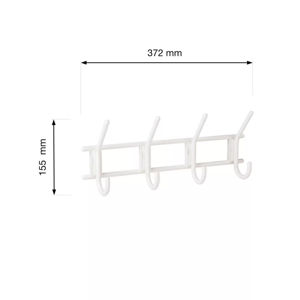 Fehér kabáttartó fogas négy akasztóval, 372 mm széles, 155 mm magas és 70 mm mély.