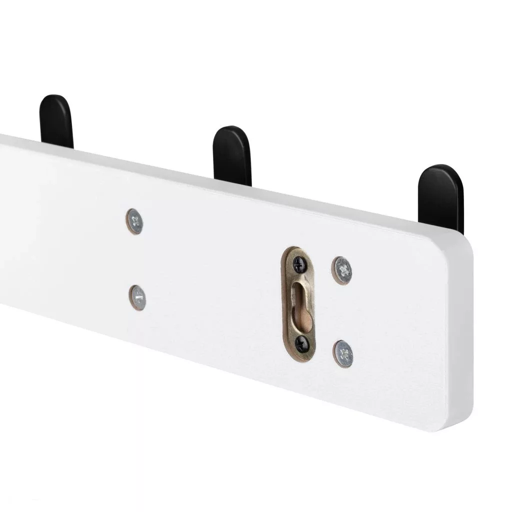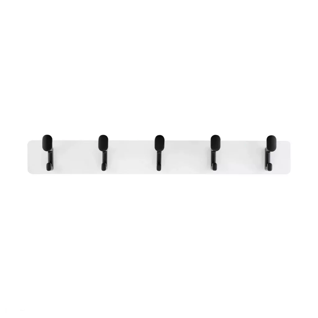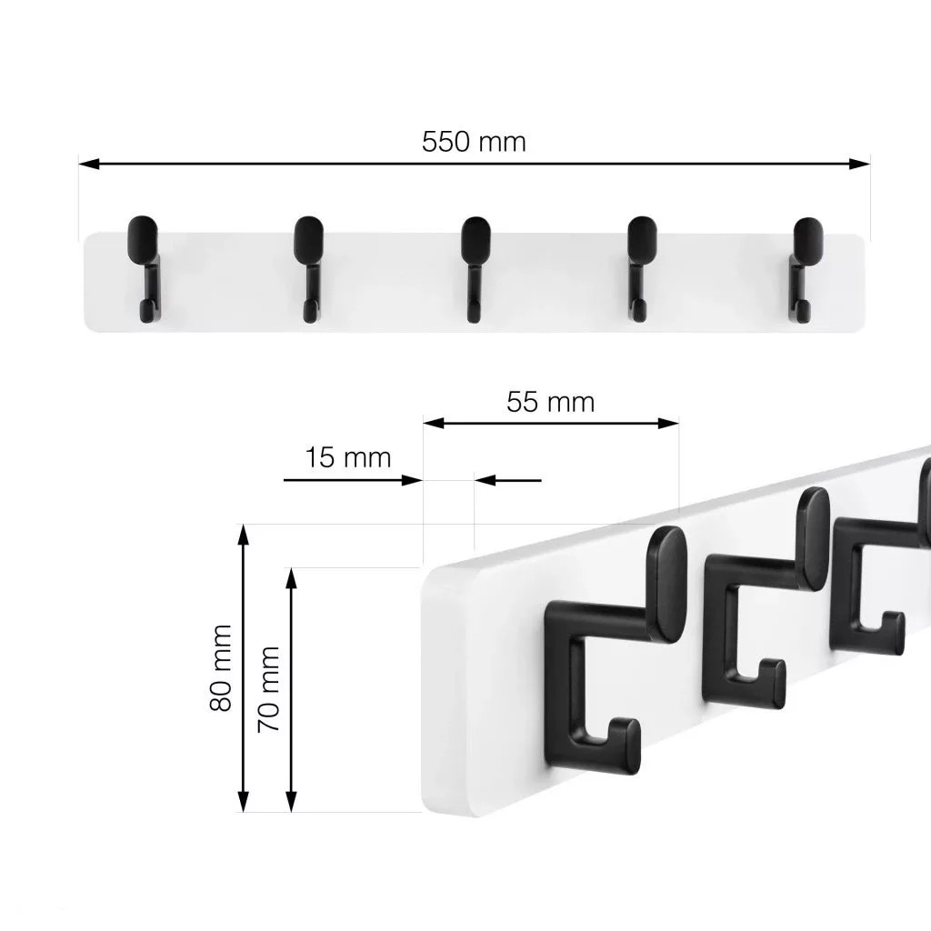 Stílusos, 550 mm széles és 70 mm magas kabáttartó fehér MDF fából, öt matt fekete akasztóval. Rögzítőanyaggal együtt.
