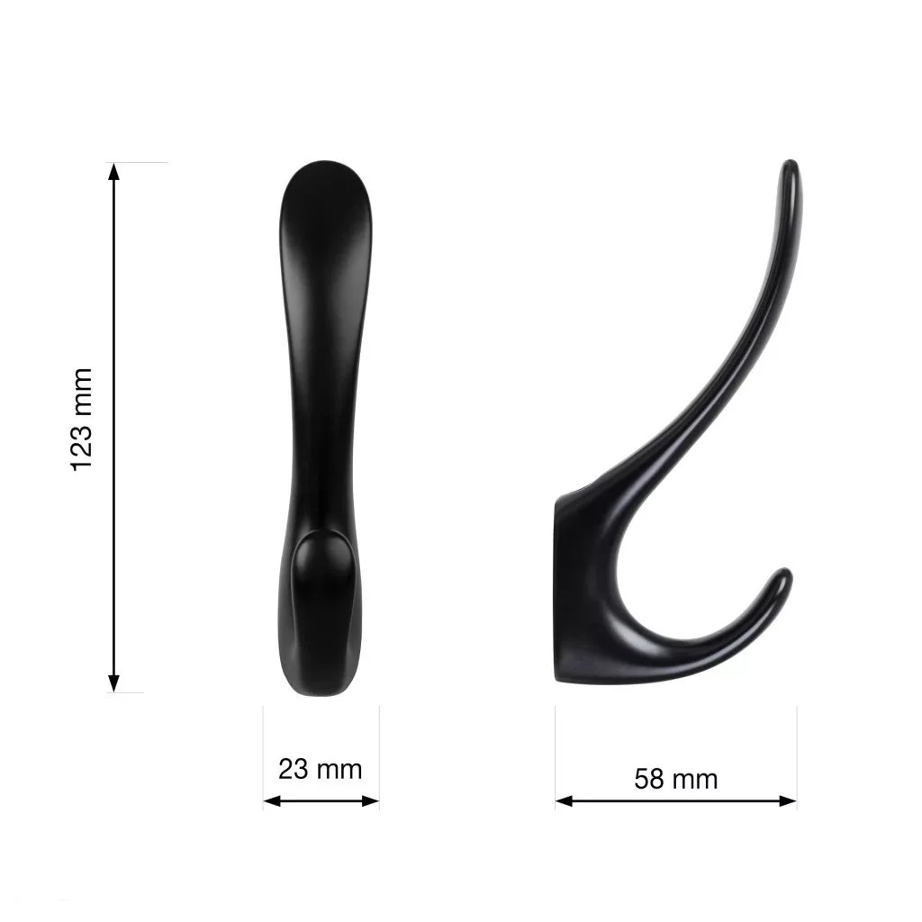 Klasszikus Maxial kabáttartó fekete színben, 23 mm széles, 123 mm magas és 58 mm mély. Falra vagy fa felületre való szereléshez 15 mm távolság szükséges. Rögzítőcsavarok mellékelve.