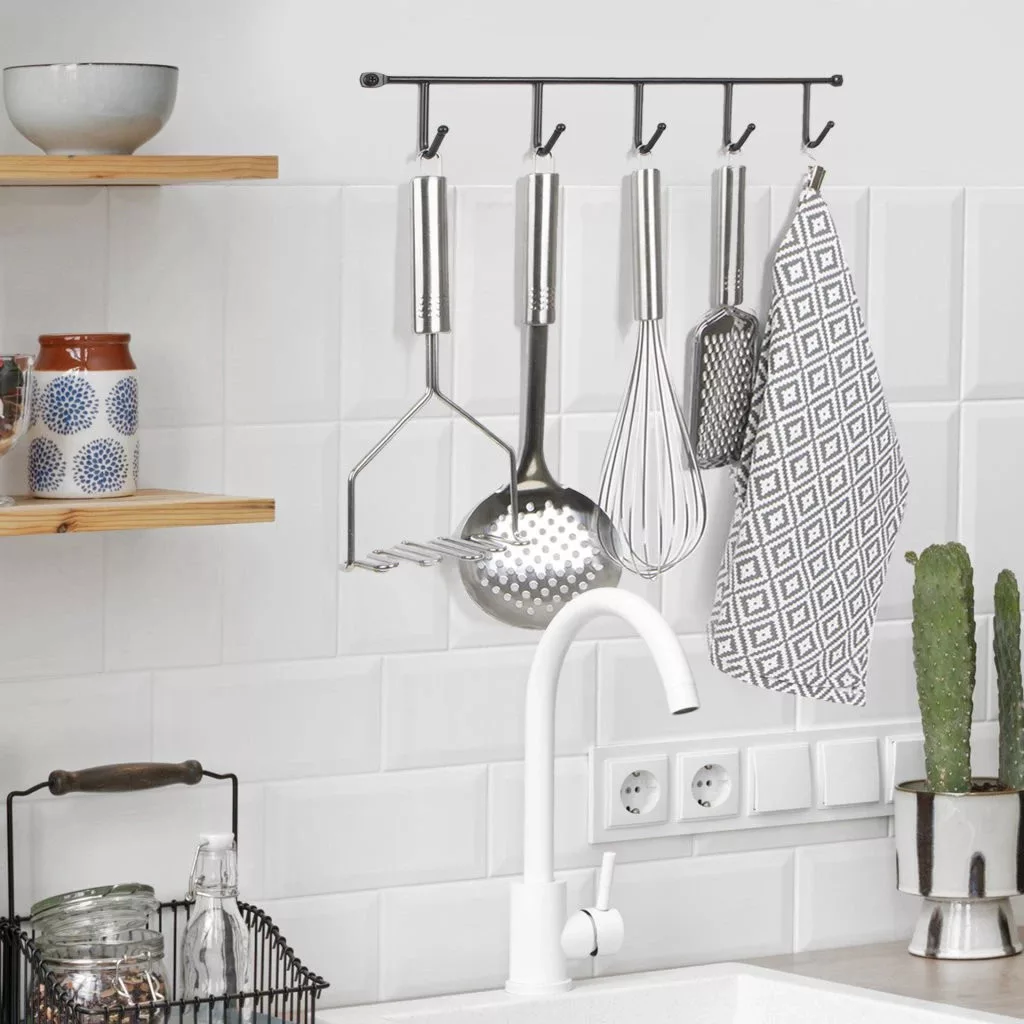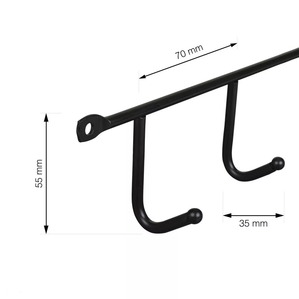 Modern fekete kabáttartó állvány öt akasztóval, 350 mm széles és 55 mm magas. Fémdrót átmérője 5 mm. Rögzítőanyaggal együtt.