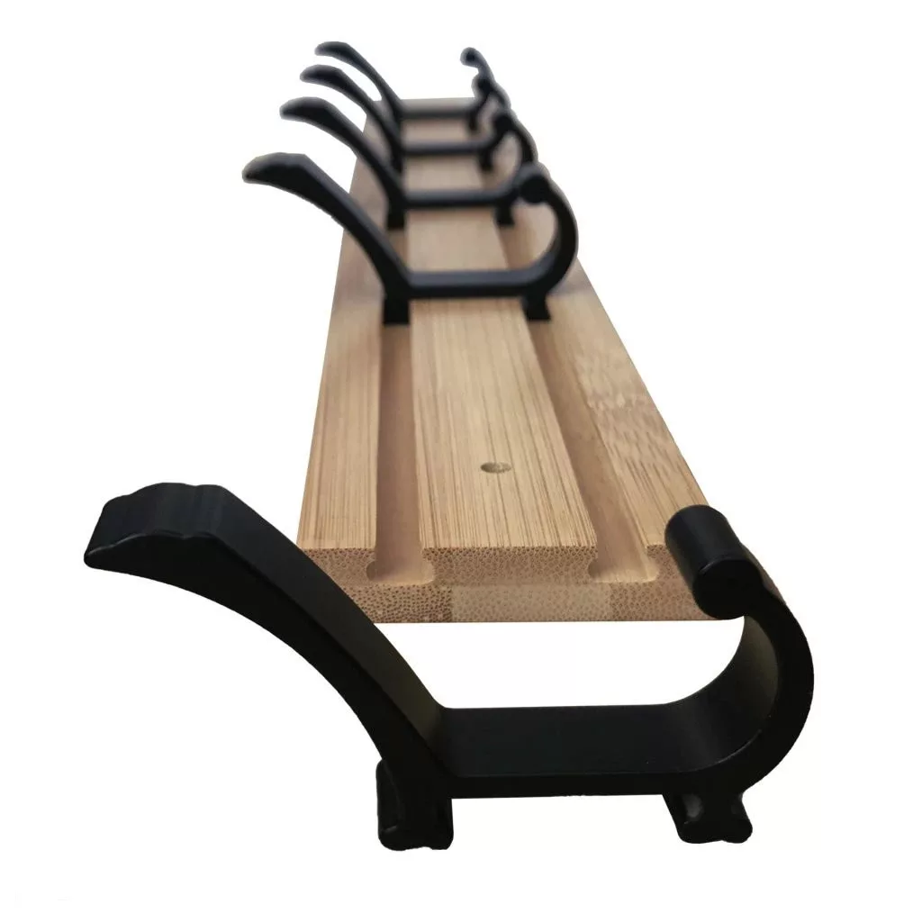 Egyedi bambuszból készült kabáttartó állvány öt matt fekete kabáttartóval kombinálva. Kabáttartó szélessége 500 mm, magassága 80 mm és mélysége 12 mm. Az egyes kabáttartók méretei - magasság 75 mm és mélység 35 mm. Összeszerelési anyagok és útmutató mellékelve.