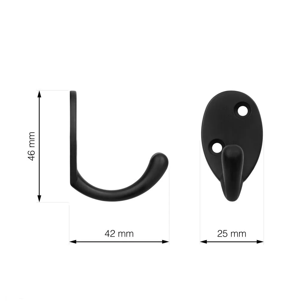 Klasszikus Polaris kabáttartó matt fekete színben, egy akasztóval, 25 mm széles, 46 mm magas és 42 mm mély. Falra vagy fa felületre való rögzítéshez 18 mm távolság. Rögzítőcsavarok mellékelve.
