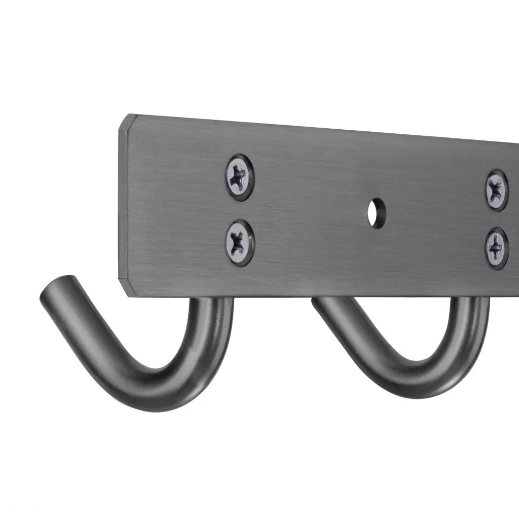 Antracit színű rozsdamentes acél kabáttartó állvány négy akasztóval, 300 mm széles, 50 mm magas és 42 mm mély. Rögzítőcsavarokkal együtt.