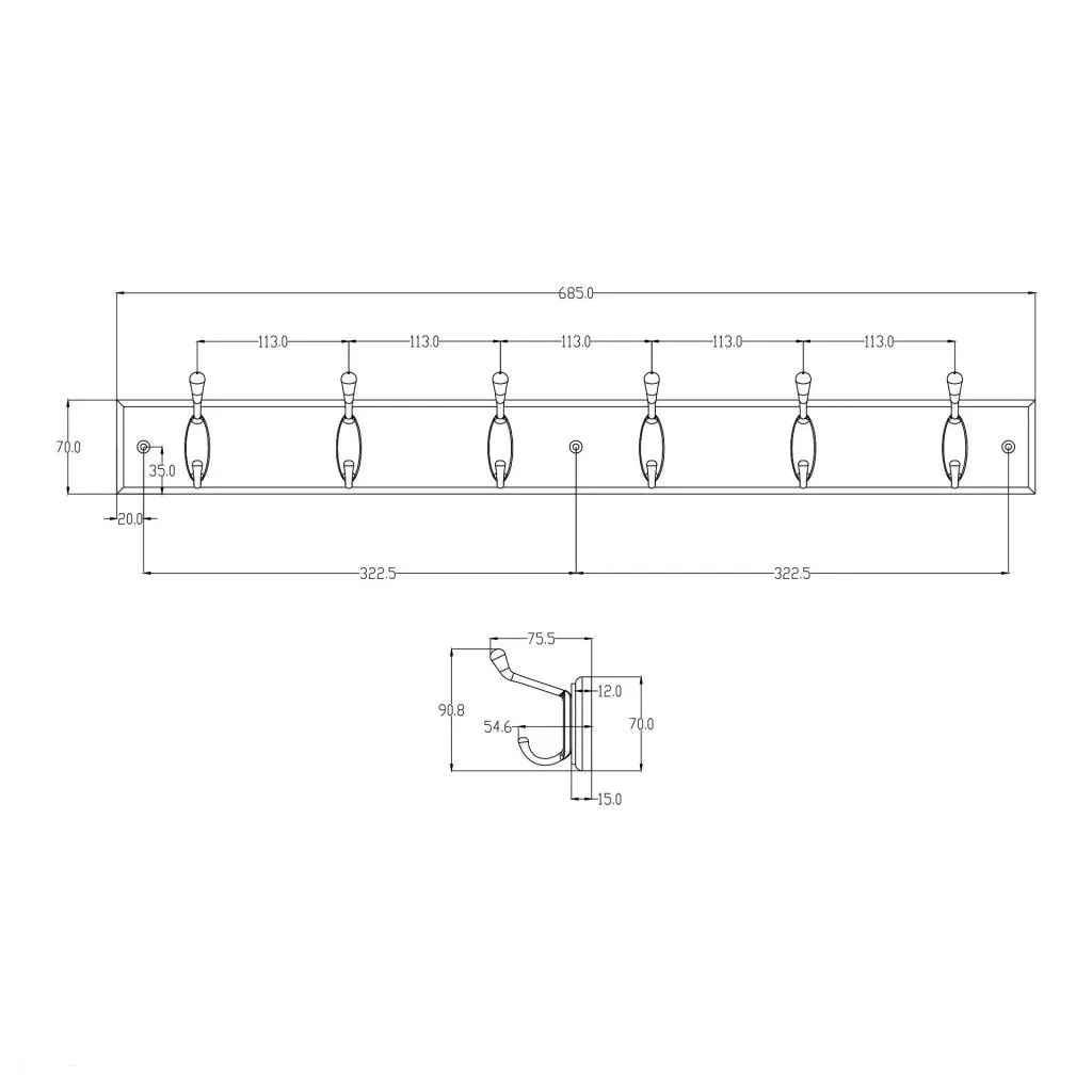 Stílusos, fehér MDF fából készült kabáttartó állvány, 685 mm széles, 90 mm magas (akasztókkal együtt) és 76 mm mély, hat krómozott akasztóval. A rögzítőanyag a csomag része.