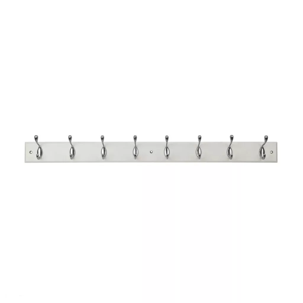 Stílusos, krémszínű MDF fából készült kabáttartó állvány, 850 mm széles, 90 mm magas (akasztókkal együtt) és 76 mm mély, nyolc matt nikkel akasztóval. Rögzítőanyaggal együtt.