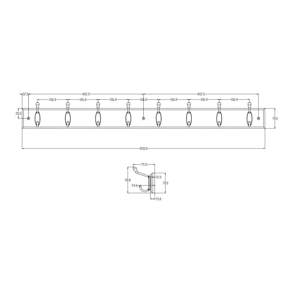 A(z) Ruhatartó 850x70 mm 8 akasztó krémszínű MDF+matt nikkel FSCŽ praktikus szerelési kiegészítő különféle barkács és műszaki feladatokhoz. Stílusos, krémszínű MDF fából készült kabáttartó állvány, 850 mm széles, 90 mm magas (akasztókkal együtt) és 76 mm mély, nyolc matt nikkel akasztóval. Rögzítőanyaggal együtt.