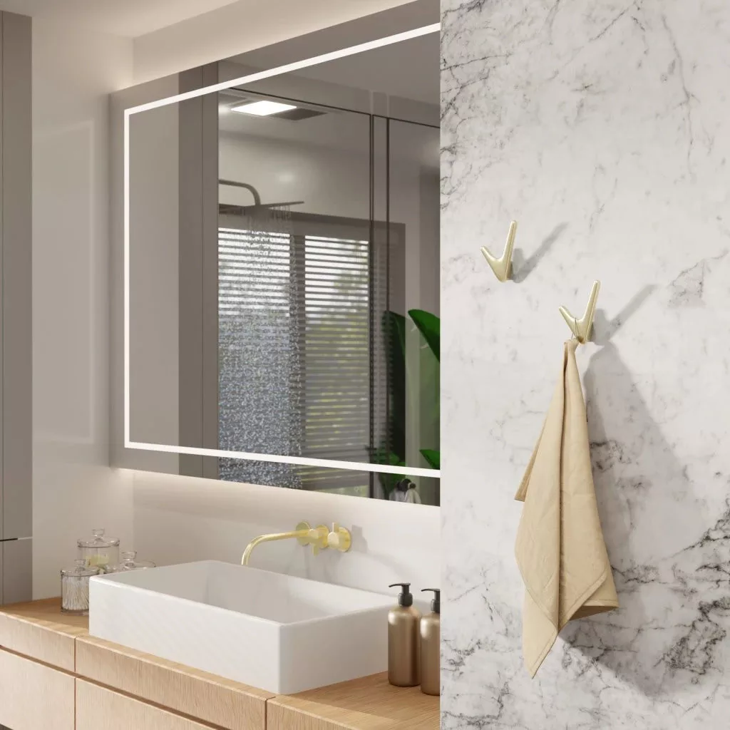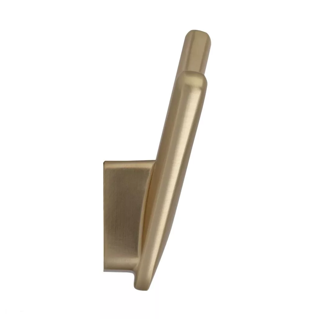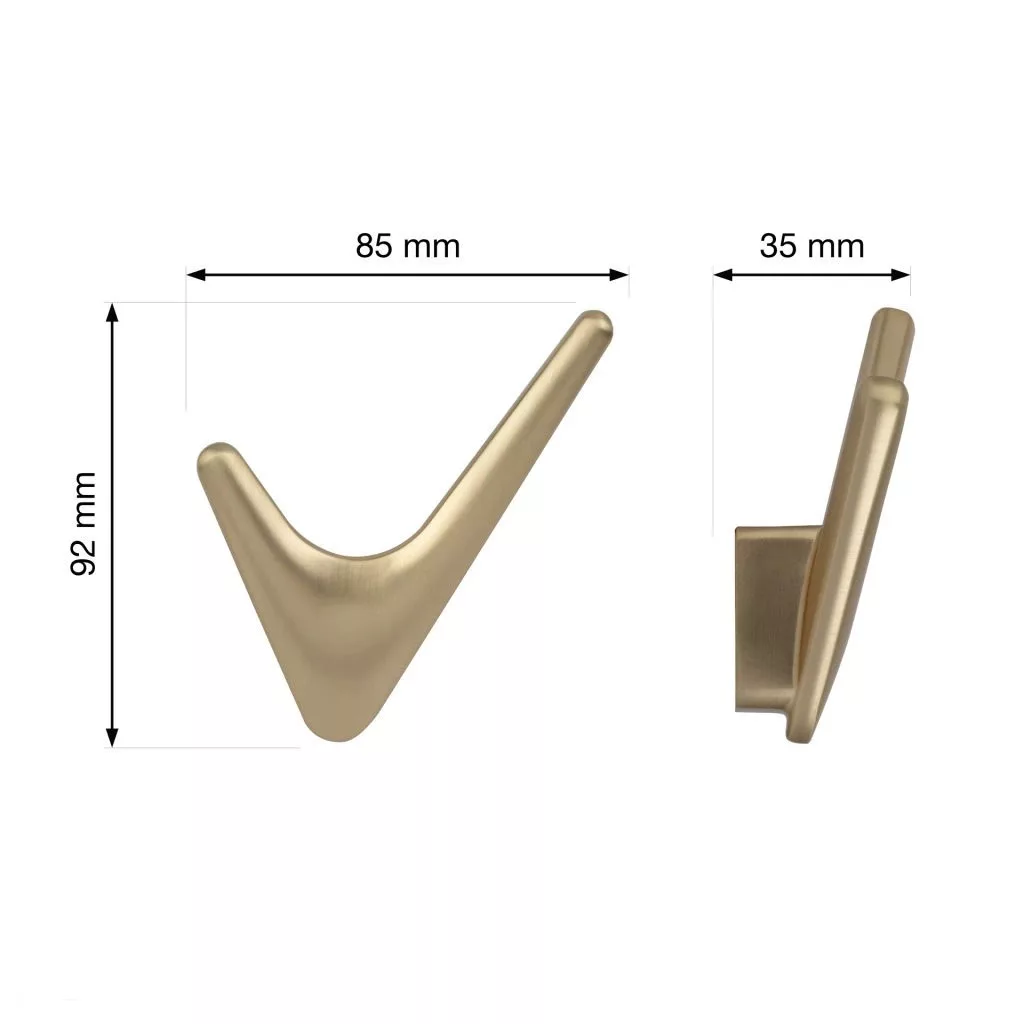 Klasszikus Nikee kabáttartó szálcsiszolt sárgarézből, 85 mm széles, 92 mm magas és 35 mm mély. Rögzítőcsavarokkal együtt.
