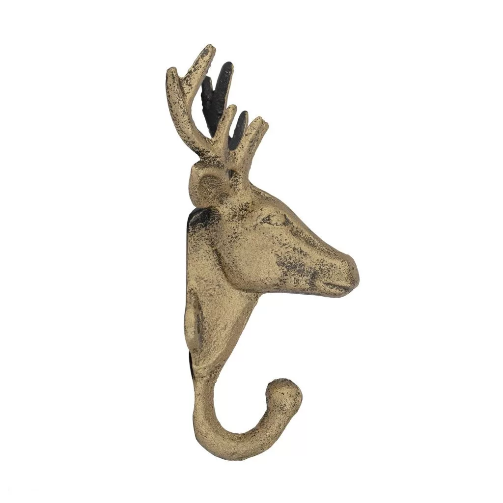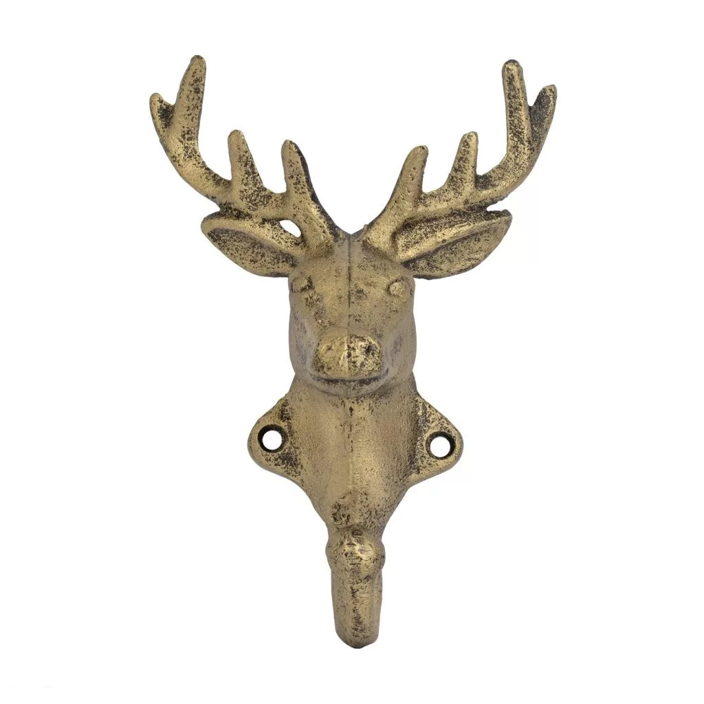 Szarvas alakú, arany színű öntöttvas akasztó, 110 mm széles, 160 mm magas és 70 mm mély. Falra vagy fa felületre való rögzítéshez 40 mm távolság szükséges. Rögzítőcsavarok mellékelve.