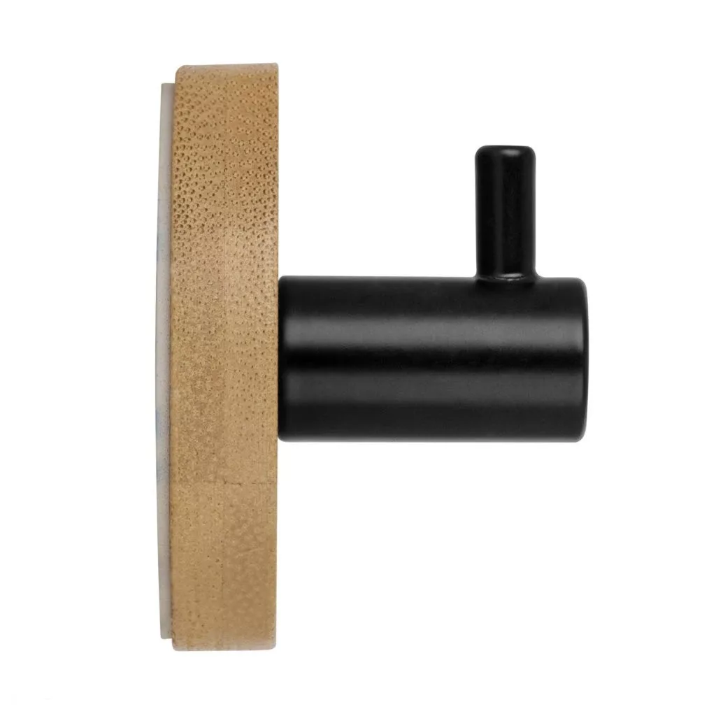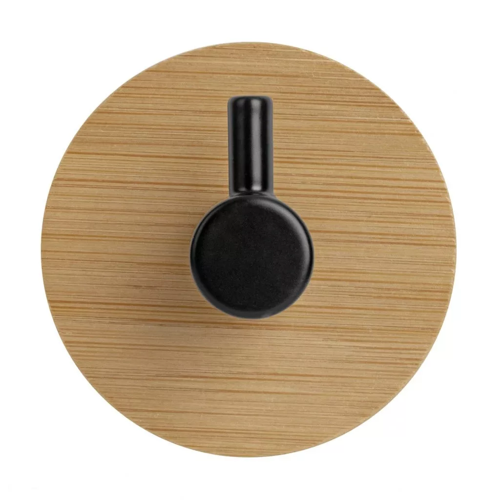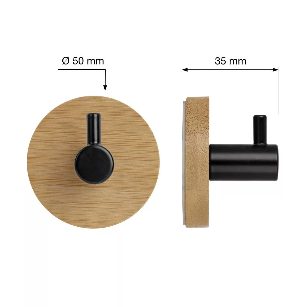 Öntapadós, kerek akasztó, 50 mm átmérőjű és 35 mm mély, bambuszfából készült, egy fekete színű kampóval.