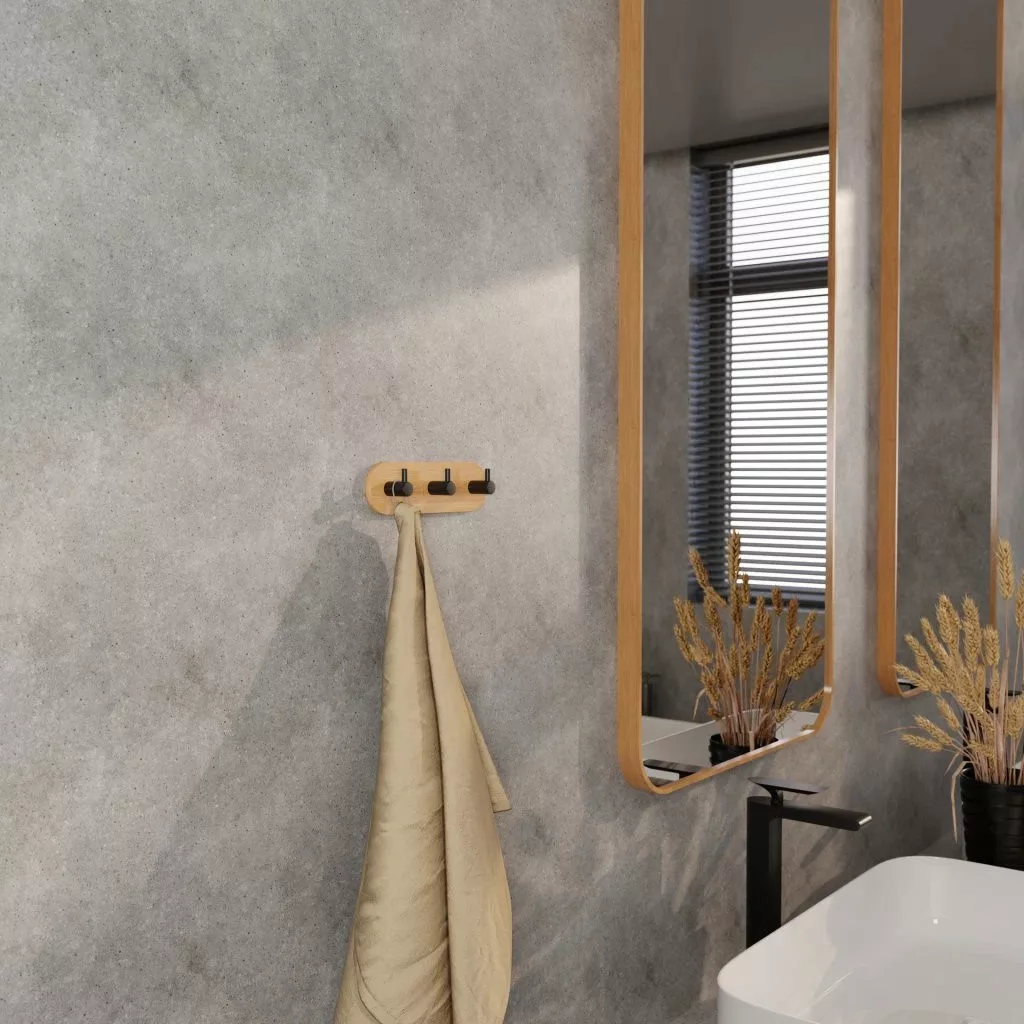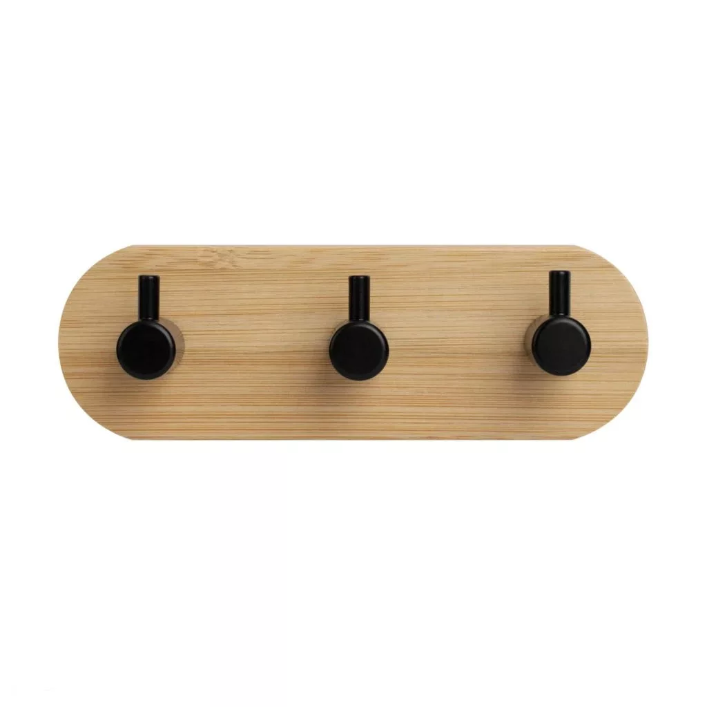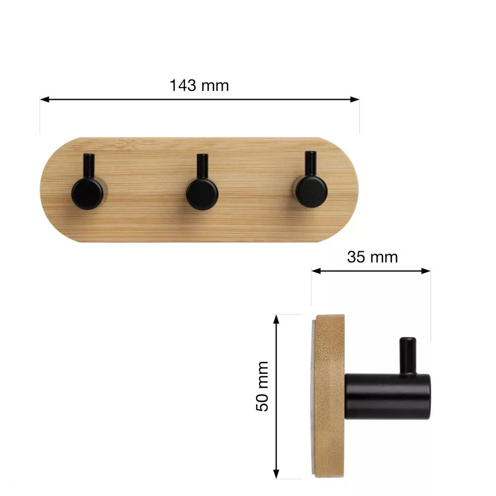 143 mm széles, 50 mm magas és 35 mm mély, öntapadós kabáttartó bambuszfából, három fekete akasztóval.