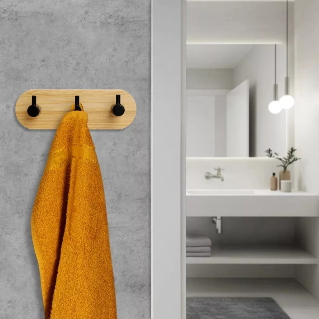A(z) Bambusz kabáttartó 3 akasztóval ovális fekete FSCŽ praktikus szerelési kiegészítő különféle barkács és műszaki feladatokhoz. 143 mm széles, 50 mm magas és 35 mm mély, öntapadós kabáttartó bambuszfából, három fekete akasztóval.