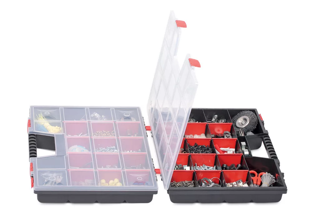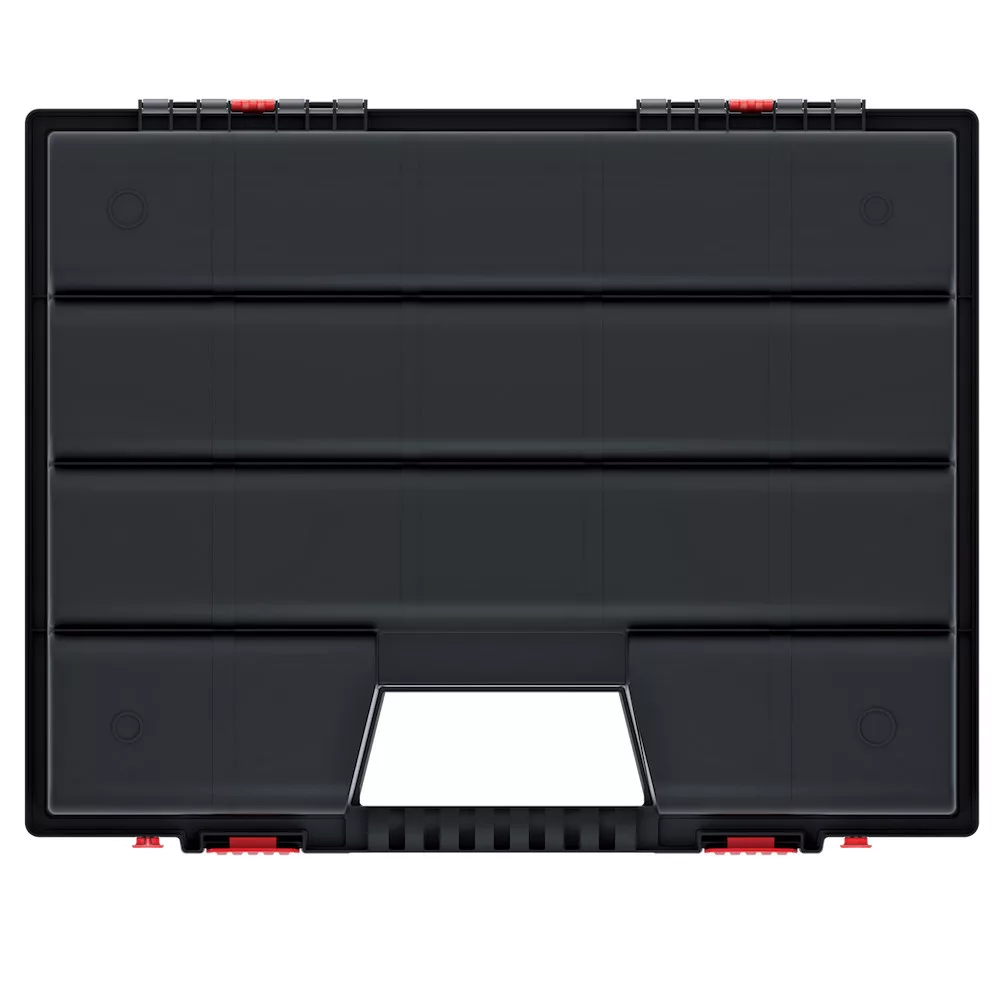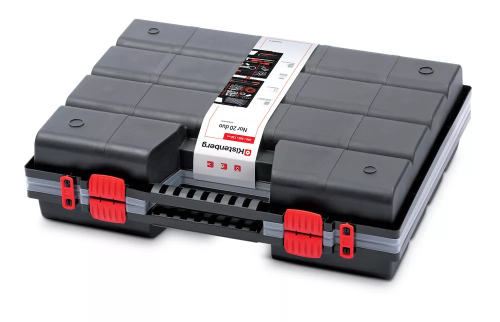 Szervező NOR DUO: A test fokozott szilárdságú polimerek keverékéből készült. Átlátszó PP Random fedél. Funkcionális partíciók. Tartós rögzítőelemek. Méret: 287X186X100MM 399X303X100MM 490X390X130MM