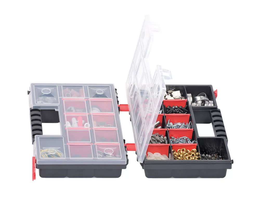 Szortimenter NORS DUO: A test fokozott szilárdságú polimerek keverékéből készült. Átlátszó PP Random fedél. Funkcionális partíciók. Tartós rögzítőelemek. Méret: 287X186X100MM 399X303X100MM 490X390X130MM