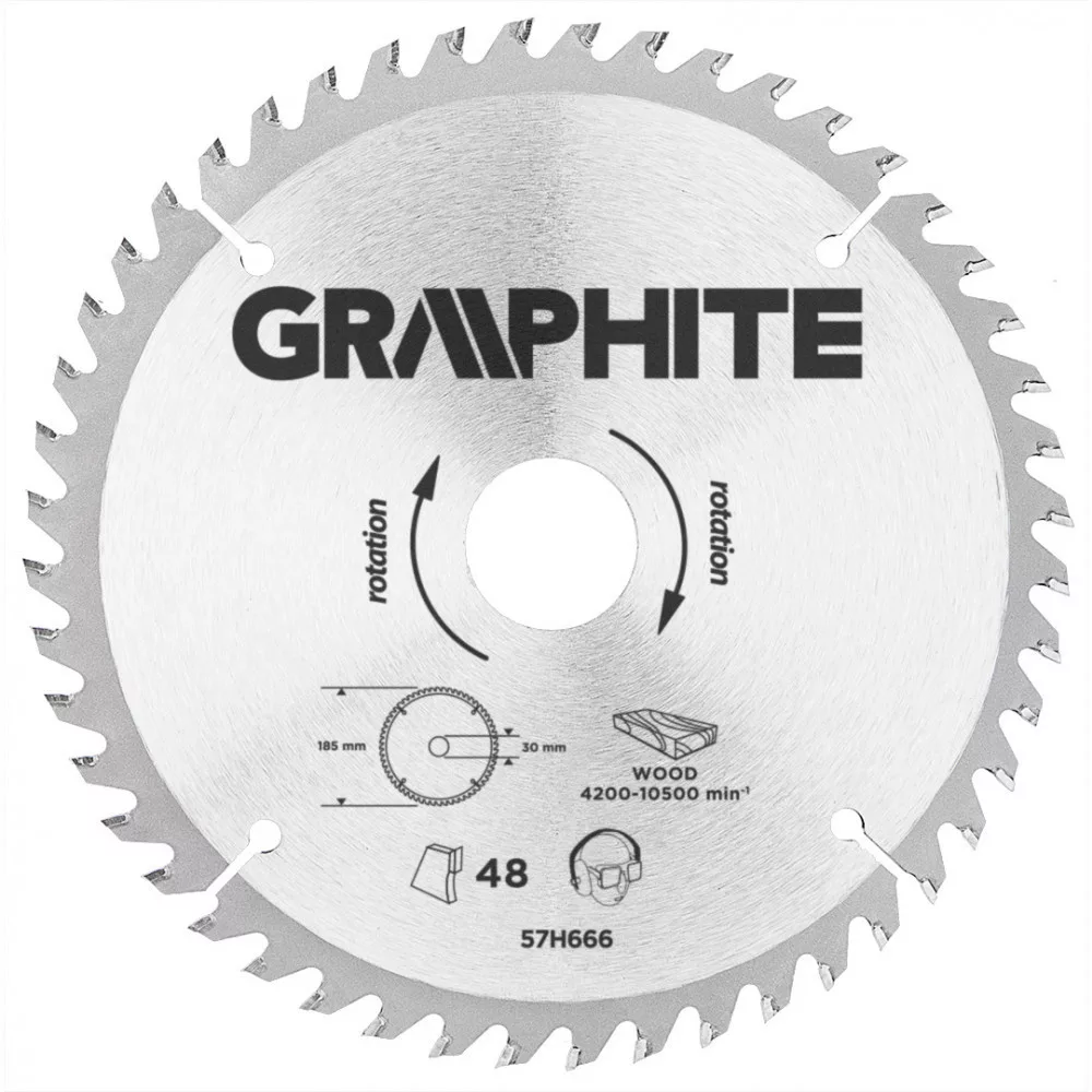 A GRAPHITE vídiabetétes fűrésztárcsa a hőmérsékletnek és a deformálódásnak igen ellenálló MN65-ös mangán acélötvözetből készül. Az YG6A vídiabetétes fogazás lehetővé teszi a fa és faalapú anyagok, mint pl. a rétegelt lemez, a forgácslap vagy az MDF lapok nagyoló vágását. A csomagolásban megtalálható szűkítő gyűrűk lehetővé teszik a fűrésztárcsák alkalmazását a fűrészgép típusok többségéhez.
