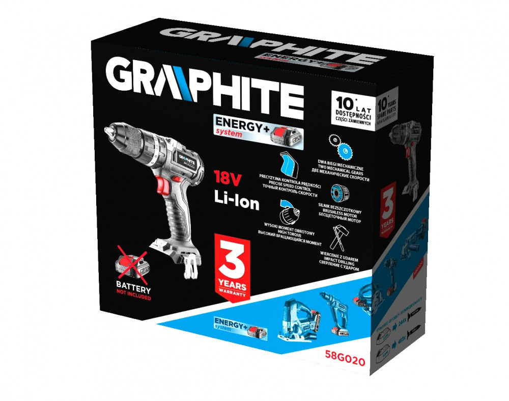 GRAPHITE kétsebességes akkus fúró/csavarozó, 18V Li-Ion GRAPHITE Energy+ akkumulátorokkal kompatibilis. A gép szerkezetében modern és nagy teljesítményű kefe mentes motor került alkalmazásra, mely kefés konstrukcióval szemben egy feltöltéssel hosszabb ideig működik, jobban szabályozható a fordulatszáma és kisebb méretű, aminek révén a berendezés jóval rövidebb, kompakt méretű. Ezen túlmenően a motor jobban bírja a nehéz munka körülményeket, a poros környezetet és jobban elvezeti a hőt, ami lehetővé teszi az intenzívebb, nagyobb megterheléssel végzett munkát. A planetáris erőátviteli szerkezet kiváló minőségű acélból készült. Az orsó maximális forgási sebessége az első fokozatban 500, a másodikban pedig 1700 fordulat percenként. A maximális forgatónyomaték 38 Nm (folyamatos / 58 Nm (max.) és 16 pozíciós fúró, valamint ütvefúró opciós tengelykapcsolóval szabályozható. Az önzáró fém fúrótokmányban 2-13 mm átmérőjű szerszámok használhatóak. A berendezés elektromos motorfékkel és automata orsórögzítővel rendelkezik. Automatikusan bekapcsoló, a munkaterületet megvilágító LED dióda. A markolat ergonomikus kialakítása a fúró-csavarozó kompakt szerkezete kényelmessé teszi a munkát nehéz körülmények között is. Az elektromos szerszám markolata csúszásmentes burkolattal került bevonásra, melynek köszönhetően az elektromos szerszám biztosan fekszik a kézben.