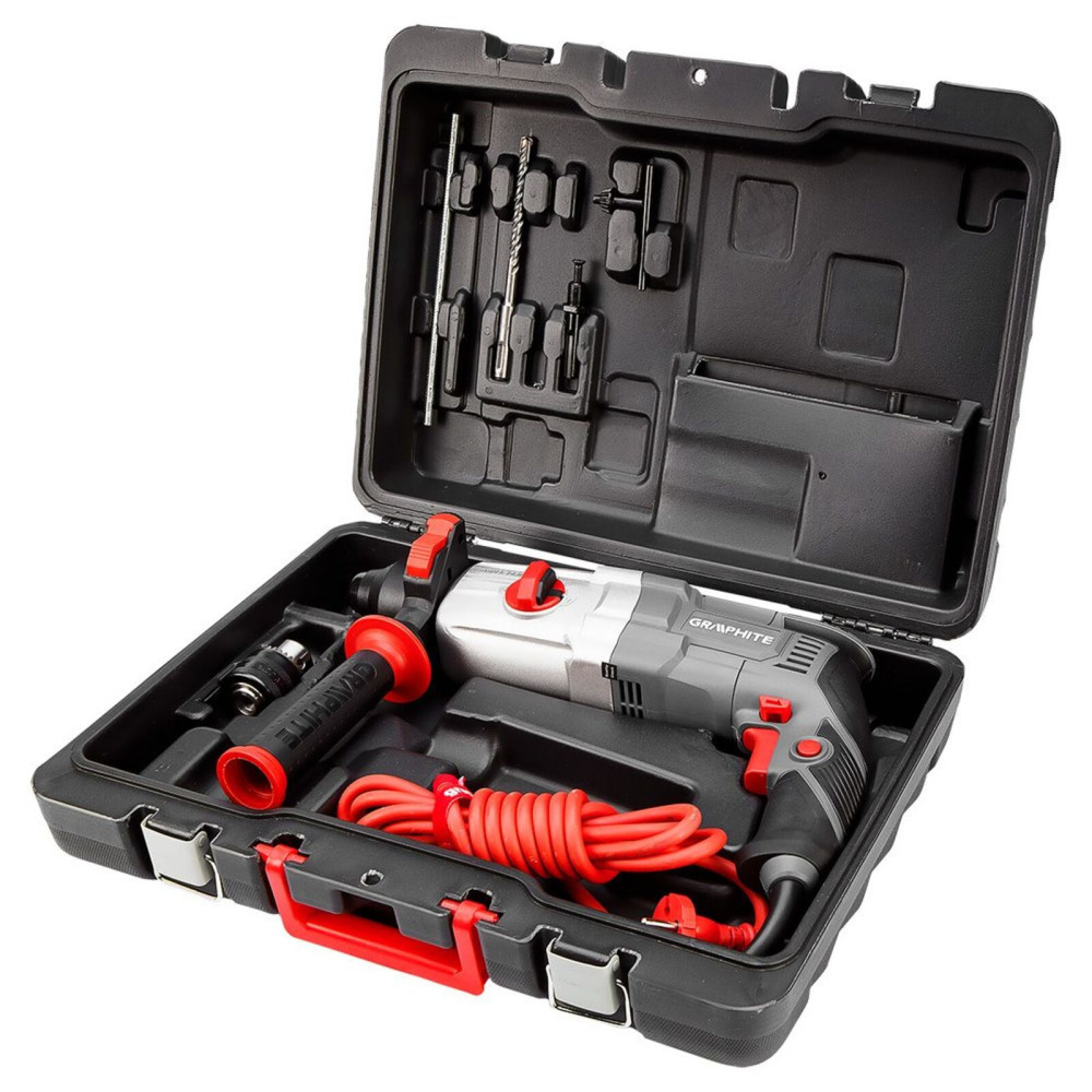 A GRAPHITE SDS+ 710W, 2,6J, tok 58G537 kalapácsfúró 710W-os SDS+ speciális szerszám fúró, kalapácsfúró, patkoló funkciókkal és a precíz patkoláshoz fokozatmentesen állítható vésőszöggel. Akár 24 mm átmérőjű lyukakat is fúrhat betonba, 13 mm átmérőjű lyukakat acélba és 30 mm átmérőjű lyukakat fába. A szerszám rendelkezik orsófordítóval, amely bal oldali fordulatszámon nem veszít teljesítményt, és be-/kikapcsoló reteszeléssel a folyamatos működéshez. Fúrás közben a fúrókalapács akár 1350 fordulat/perc fordulatszámot is elér, ütőfúrásra kapcsolva pedig akár 5500 löket/perc. A szerszám ütési energiája 2,6 J. A szerszám kényelmes fő fogantyúja csúszásmentes betéttel van ellátva, így jól fekszik a kézben. A készlet tartalmaz egy betonfúrófejet, fúrótokmányt, tokmányadaptert és hordtáskát. A készülék rugalmas és tartós, 3 m hosszú, gumibevonatú tápkábellel van ellátva, amely szintén professzionális és ipari felhasználásra készült, beltéri és kültéri használatra egyaránt. Az európai szabványoknak való megfelelést a CE tanúsítás biztosítja.