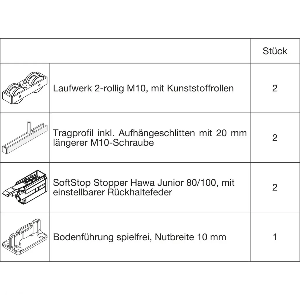 HAWA Junior 100/B  vasalatszett fához SoftStop 20 mm-rel hosszabb csavar (30230)