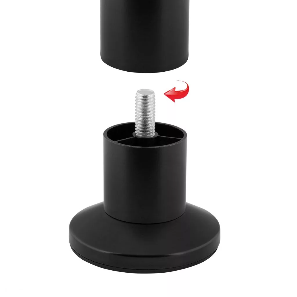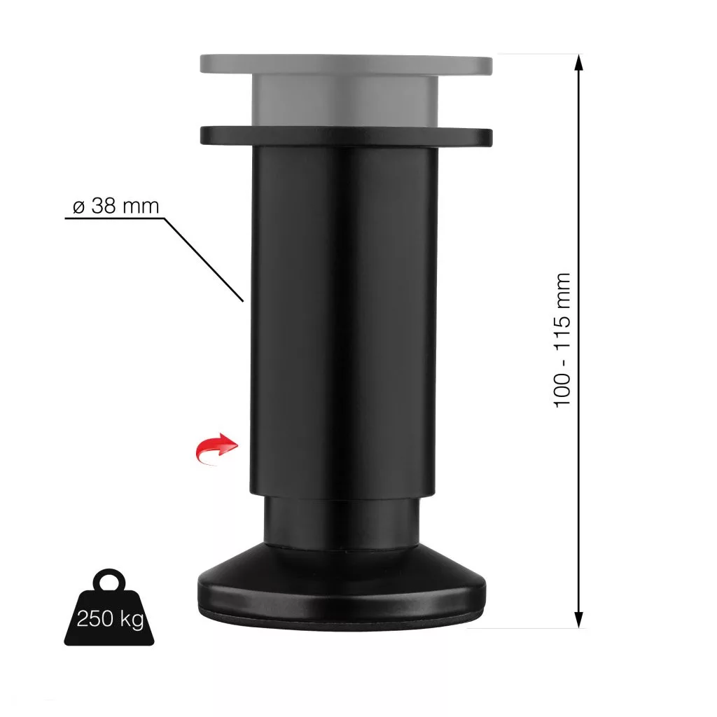 Elegáns, magasságban állítható bútorláb matt fekete színben, 38 mm átmérővel (keskenyebb része 32 mm), 100-115 mm állítható magassággal. Egyedülállóak a teherbírásukban, amely akár 250 kg is lehet. Cikkünk segít a magasságban állítható bútorlábak kiválasztásában.