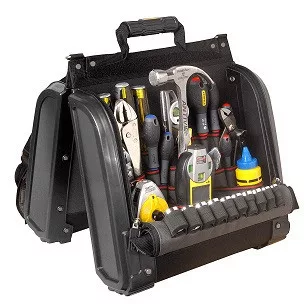 Extra erős-anyag kombinációja révén terhelés és kopás ellenálló Szerszámok függőleges helyzetben helyezkednek el, könnyű hozzáférést biztosítva Előzetesen megtervezett tárolórészek kulcsok, dugókulcsok részére Oldalain erősített rész, stabilitást biztosít és védelmet nyújt a szerszámok tárolásához Ergonomikus egyedi forma Szivaccsal bélelt vállra akasztható rész, gumis fogantyú Egyszerű nyitással praktikus hozzáférést biztosít A formájával Képen látható szerszámok nélkül
